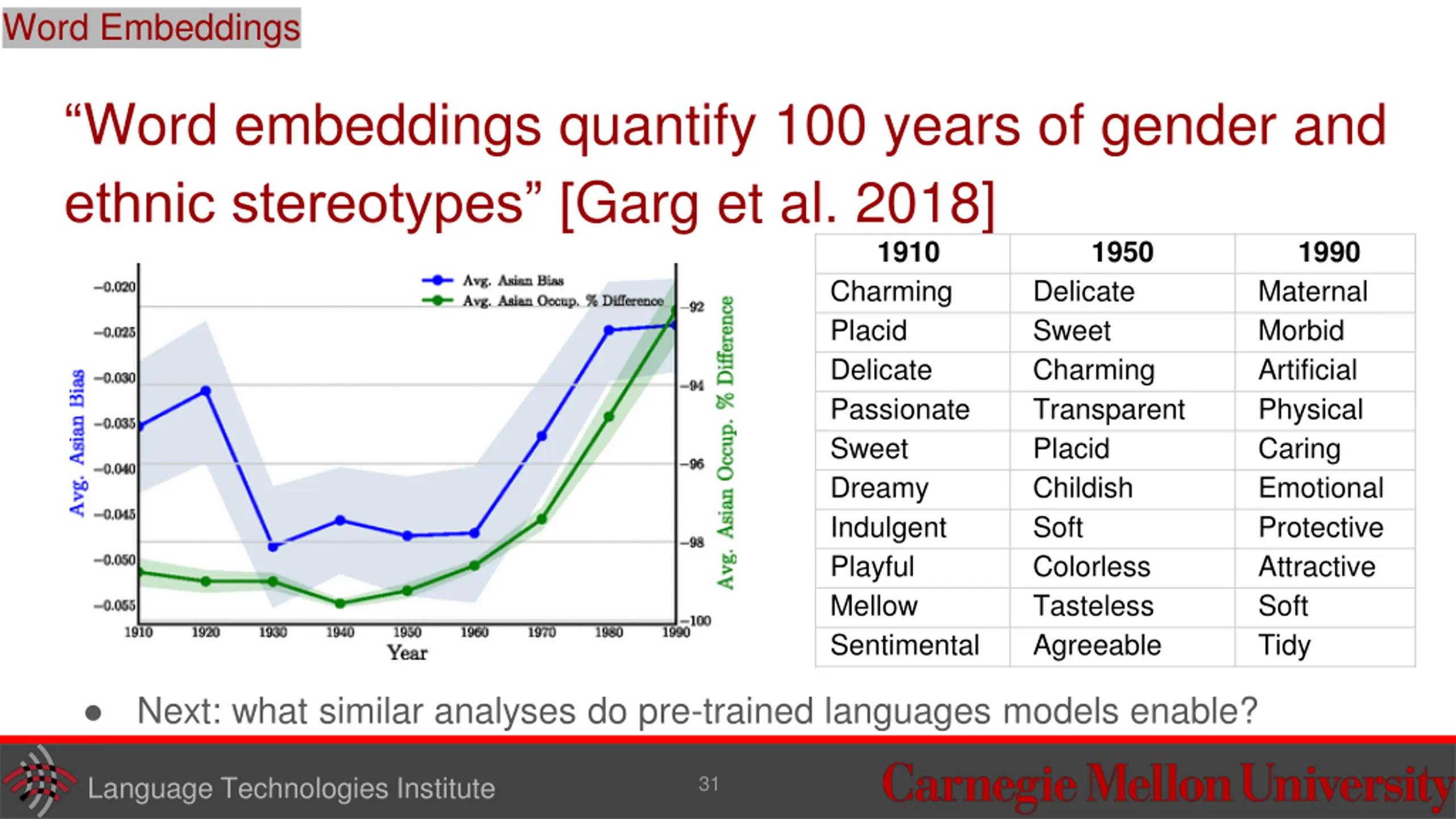 Word Embeddings Word embeddings quantify 100 years of gender and ethnic stereotypes [Garg et al. 2018] 1910 1950 1990 Charming Placid Delicate Passionate Sweet Dreamy Indulgent Playful Mellow Sentimental Delicate Sweet Charming Transparent Placid Childish Soft Colorless Tasteless Agreeable Maternal Morbid Artificial Physical Caring Emotional Protective Attractive Soft Tidy Next: what similar analyses do pre-trained languages models enable? 31 Language Technologies Institute 31
