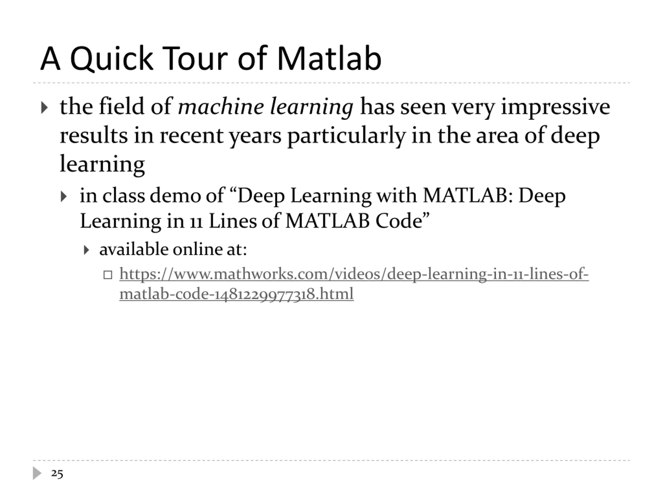 A Quick Tour of Matlab the field of machine learning has seen very impressive results in recent years particularly in the area of deep learning in class demo of Deep Learning with MATLAB: Deep Learning in 11 Lines of MATLAB Code available online at: https://www.mathworks.com/videos/deep-learning-in-11-lines-of- matlab-code-1481229977318.html 25
