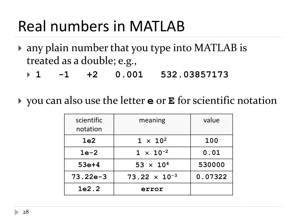 Real numbers in MATLAB any plain number that you type into MATLAB is treated as a double; e.g., 1 -1 +2 0.001 532.03857173 you can also use the letter e or E for scientific notation scientific notation 1e2 1e-2 53e+4 73.22e-3 1e2.2 meaning value 1 102 1 10-2 53 104 73.22 10-3 error 100 0.01 530000 0.07322 28