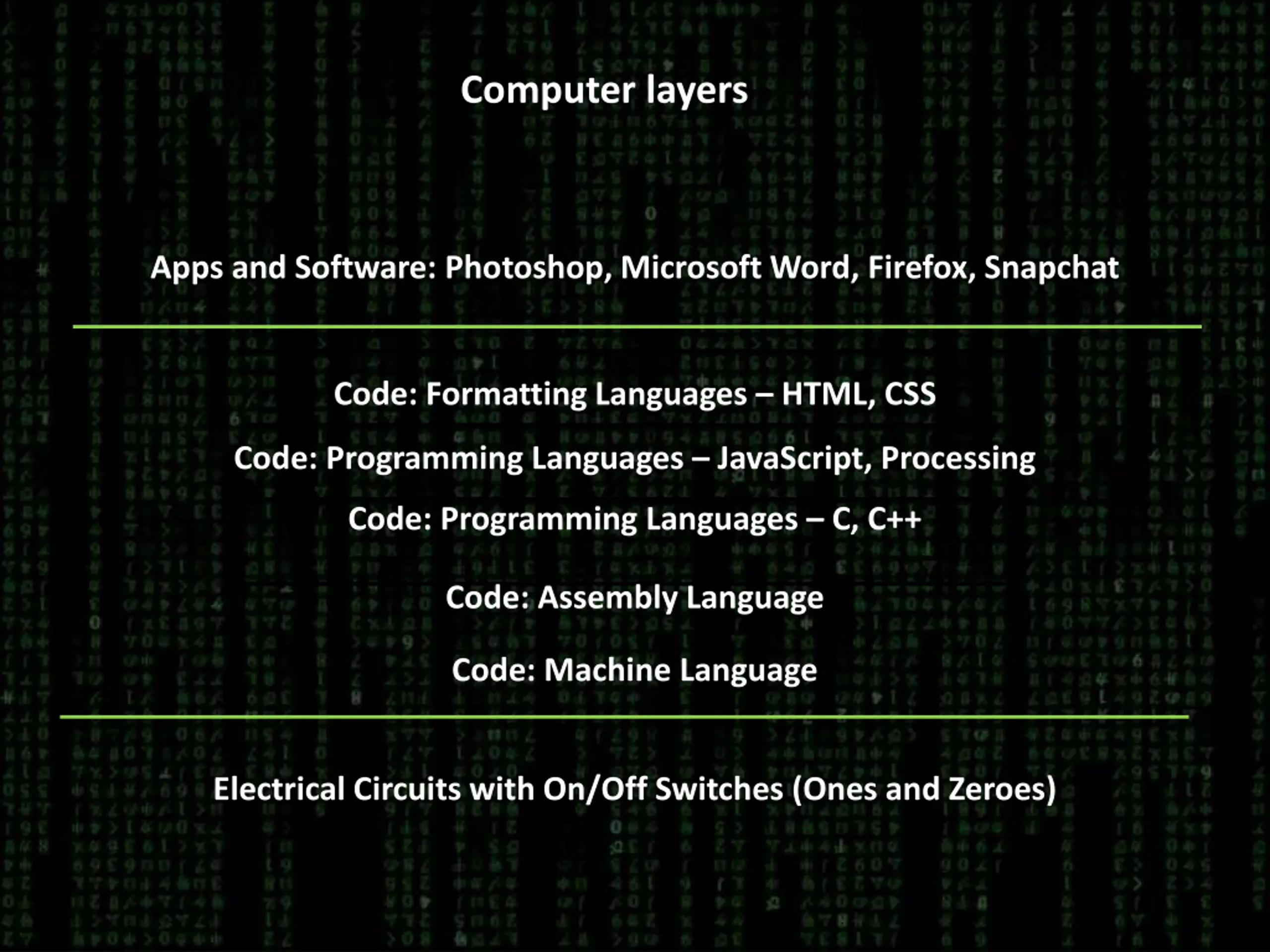 Computer layers Apps and Software: Photoshop, Microsoft Word, Firefox, Snapchat Code: Formatting Languages HTML, CSS Code: Programming Languages JavaScript, Processing Code: Programming Languages C, C++ Code: Assembly Language Code: Machine Language Electrical Circuits with On/Off Switches (Ones and Zeroes)