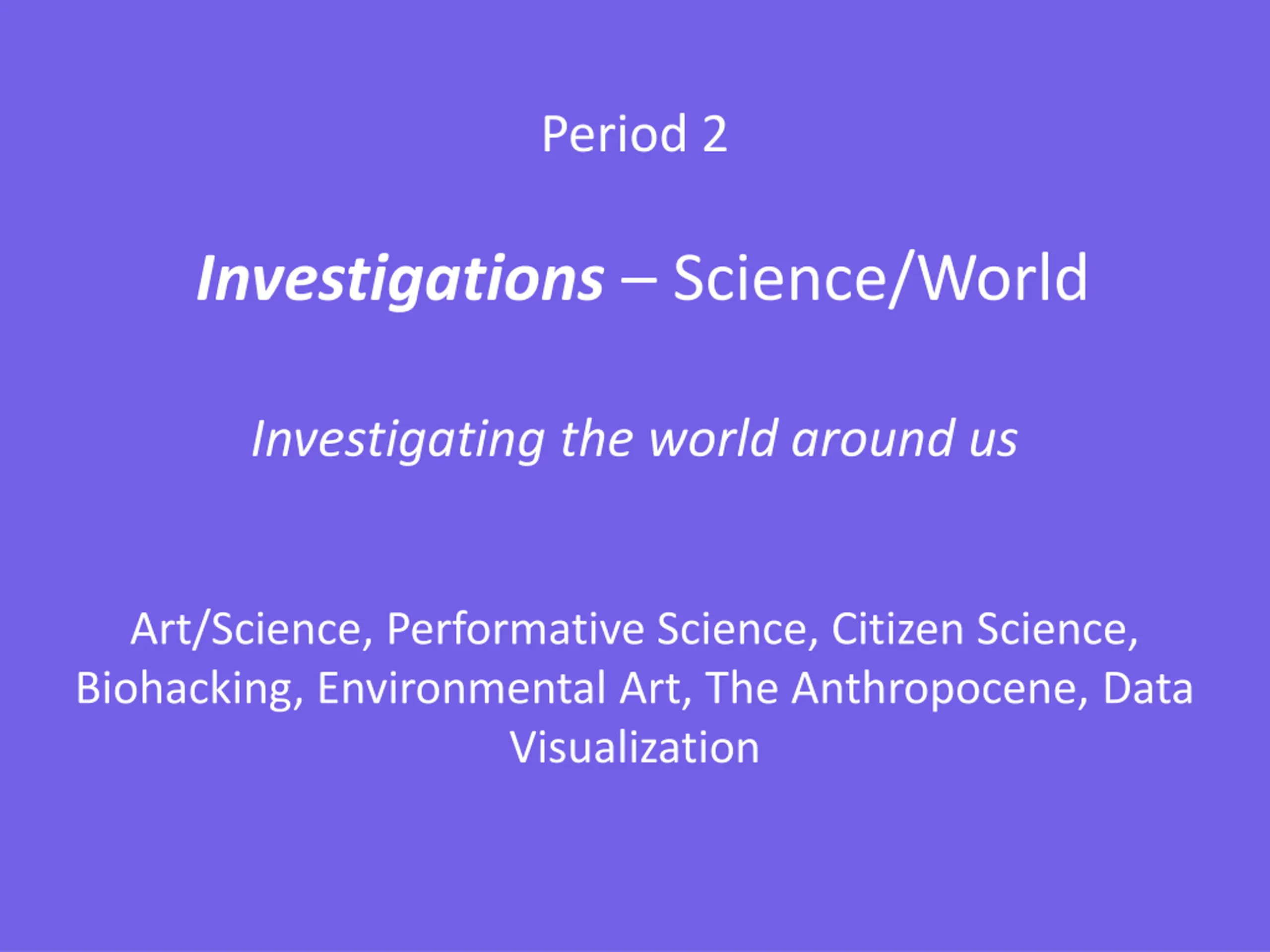 Period 2 Investigations Science/World Investigating the world around us Art/Science, Performative Science, Citizen Science, Biohacking, Environmental Art, The Anthropocene, Data Visualization