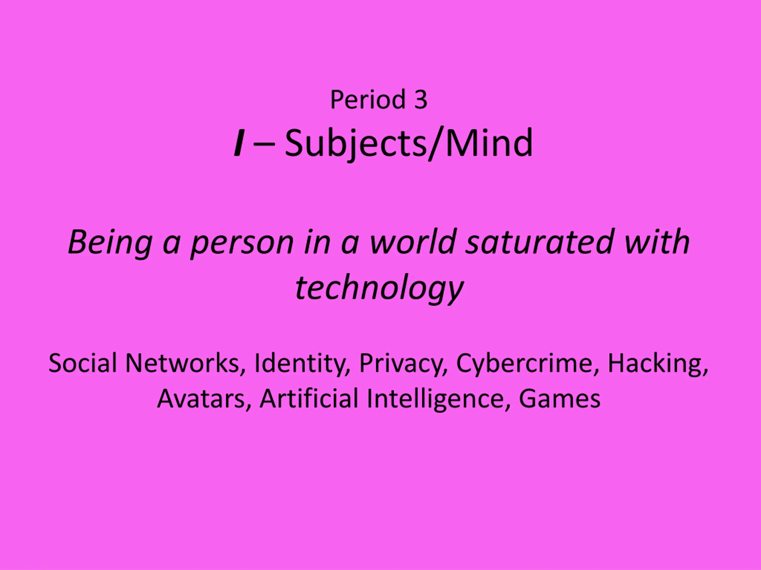 Period 3 I Subjects/Mind Being a person in a world saturated with technology Social Networks, Identity, Privacy, Cybercrime, Hacking, Avatars, Artificial Intelligence, Games