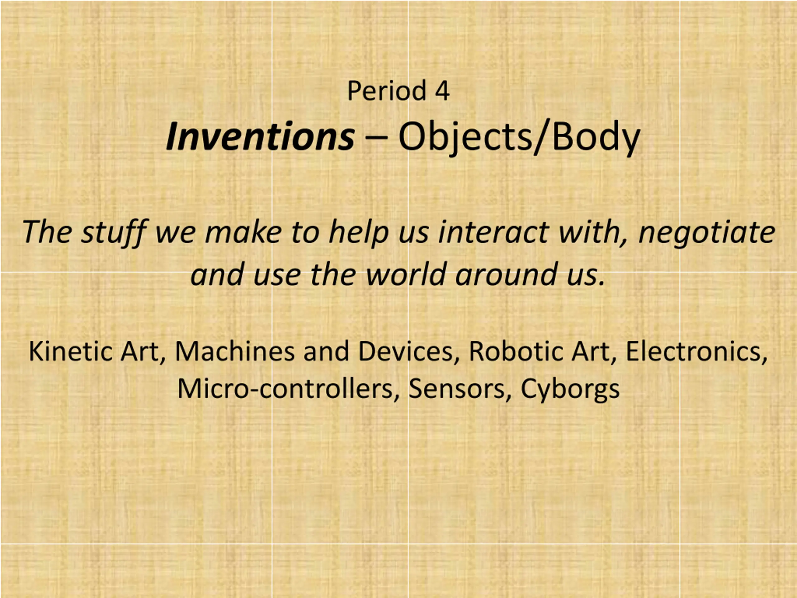 Period 4 Inventions Objects/Body The stuff we make to help us interact with, negotiate and use the world around us. Kinetic Art, Machines and Devices, Robotic Art, Electronics, Micro-controllers, Sensors, Cyborgs