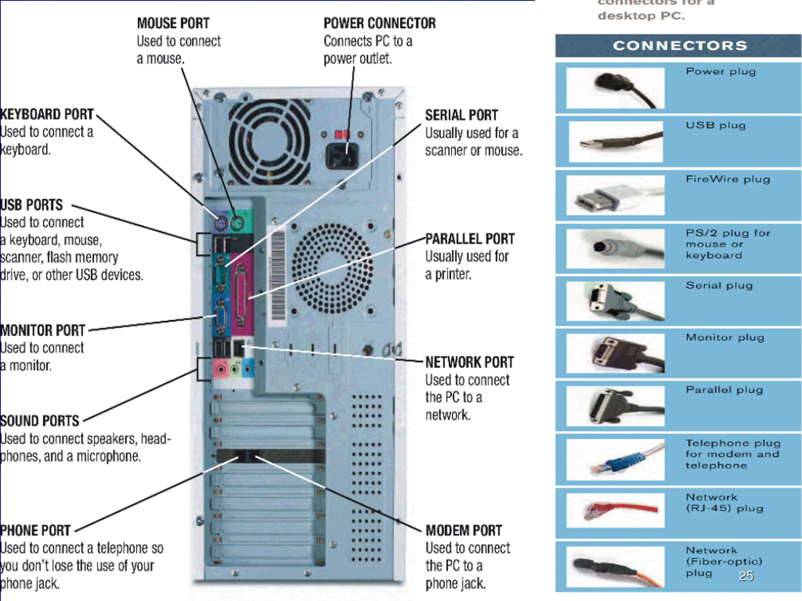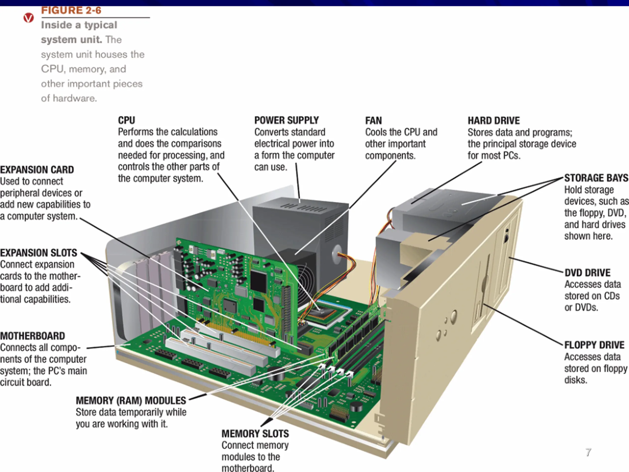 Motherboard -RAM -Expansion Slots -Expansion Cards -Processor, on which a fan or a heat sink is mounted. -Battery -Power supply to convert the 200v ac to 3.3 v dc. -Clock, which generates series of pulses per second -Chip Sets -ROM -Connectors 24
