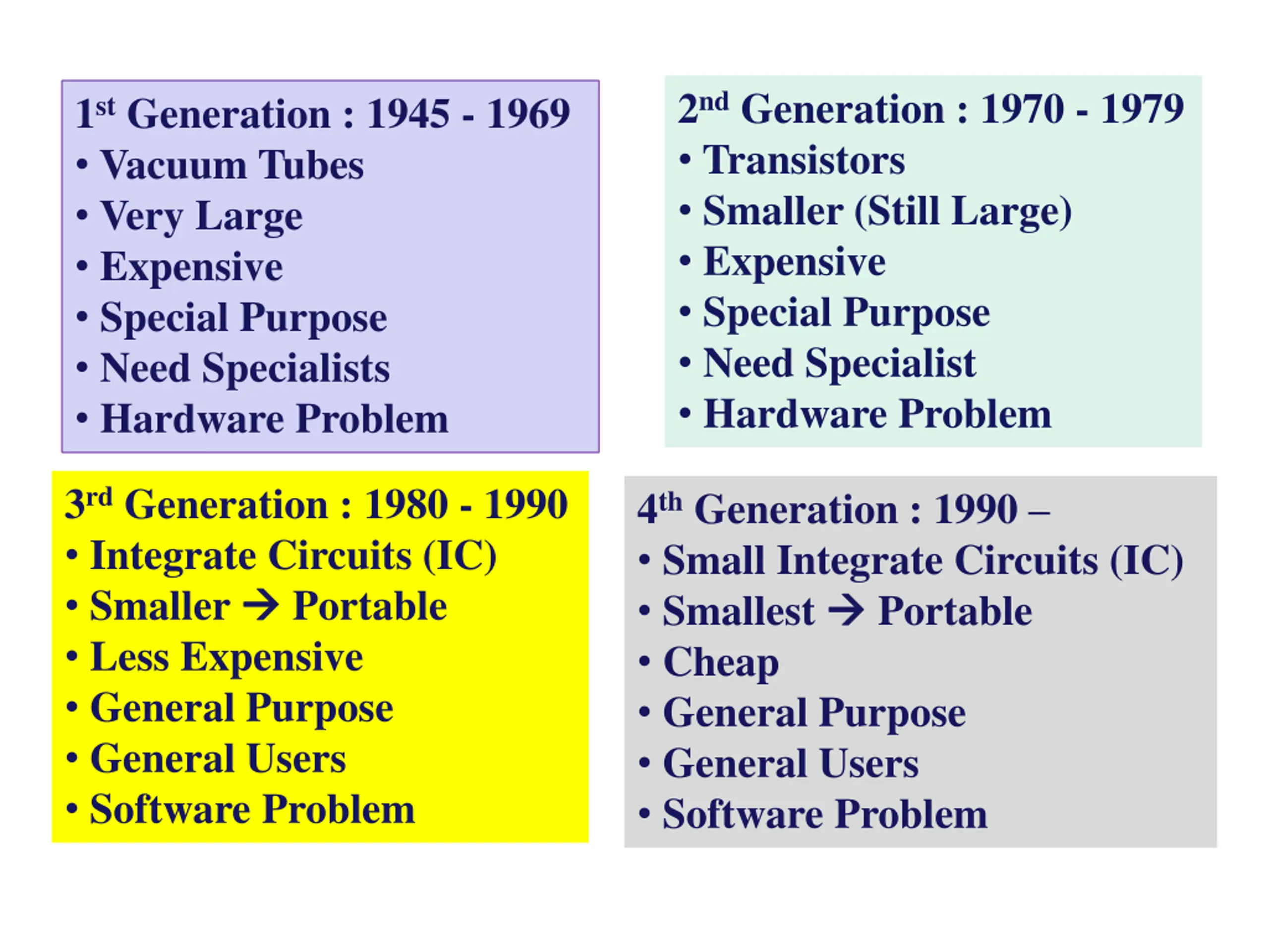 2nd Generation : 1970 - 1979 Transistors Smaller (Still Large) Expensive Special Purpose Need Specialist Hardware Problem 1st Generation : 1945 - 1969 Vacuum Tubes Very Large Expensive Special Purpose Need Specialists Hardware Problem 3rd Generation : 1980 - 1990 Integrate Circuits (IC) Smaller Portable Less Expensive General Purpose General Users Software Problem 4th Generation : 1990 Small Integrate Circuits (IC) Smallest Portable Cheap General Purpose General Users Software Problem