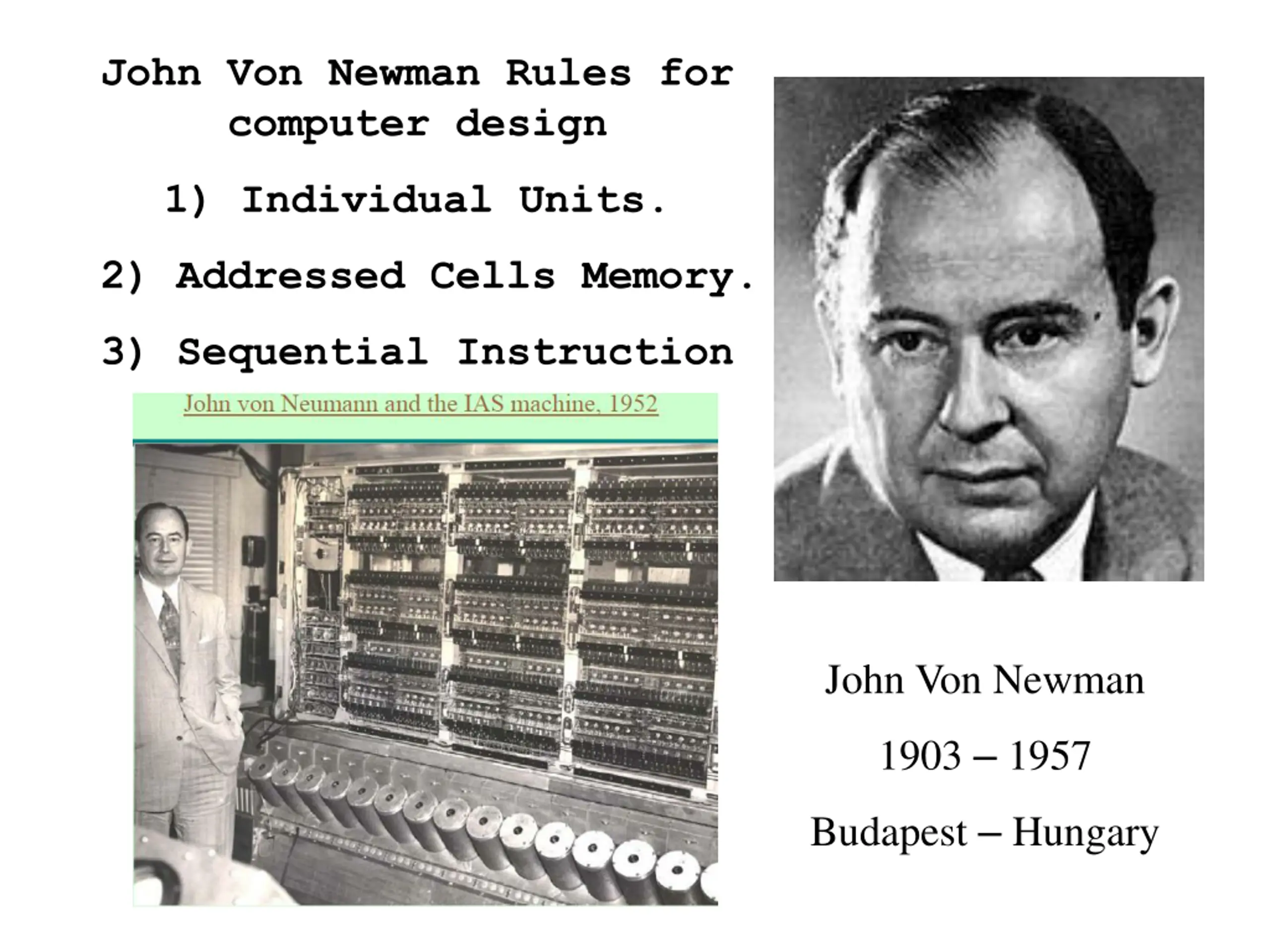 John Von Newman Rules for computer design 153px-JohnvonNeumann-LosAlamos 1) Individual Units. 2) Addressed Cells Memory. 3) Sequential Instruction John Von Newman 1903 1957 Budapest Hungary