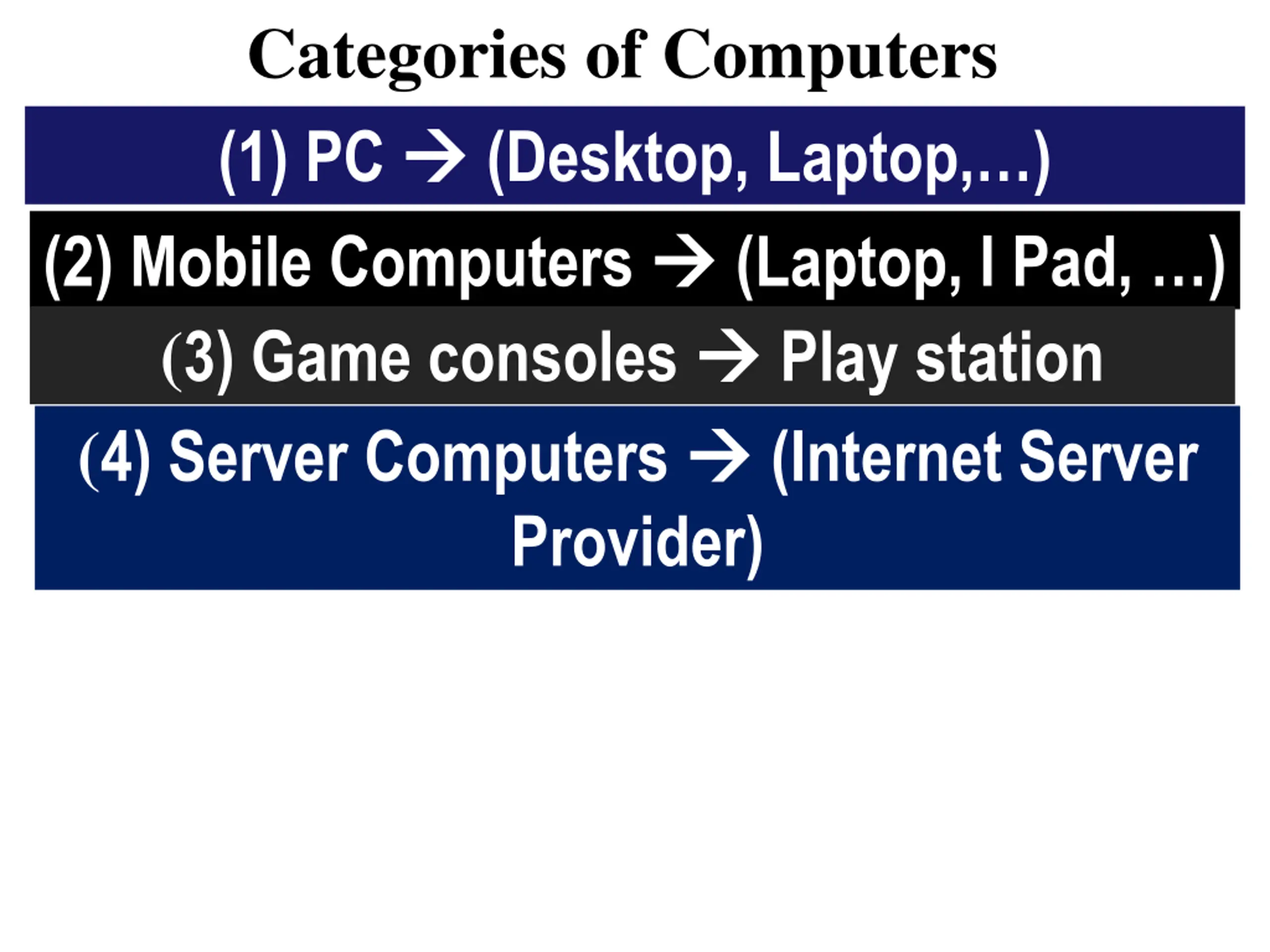 Categories of Computers (1) PC (Desktop, Laptop, ) (2) Mobile Computers (3) Game consoles (4) Server Computers Provider) (Laptop, I Pad, ) Play station (Internet Server