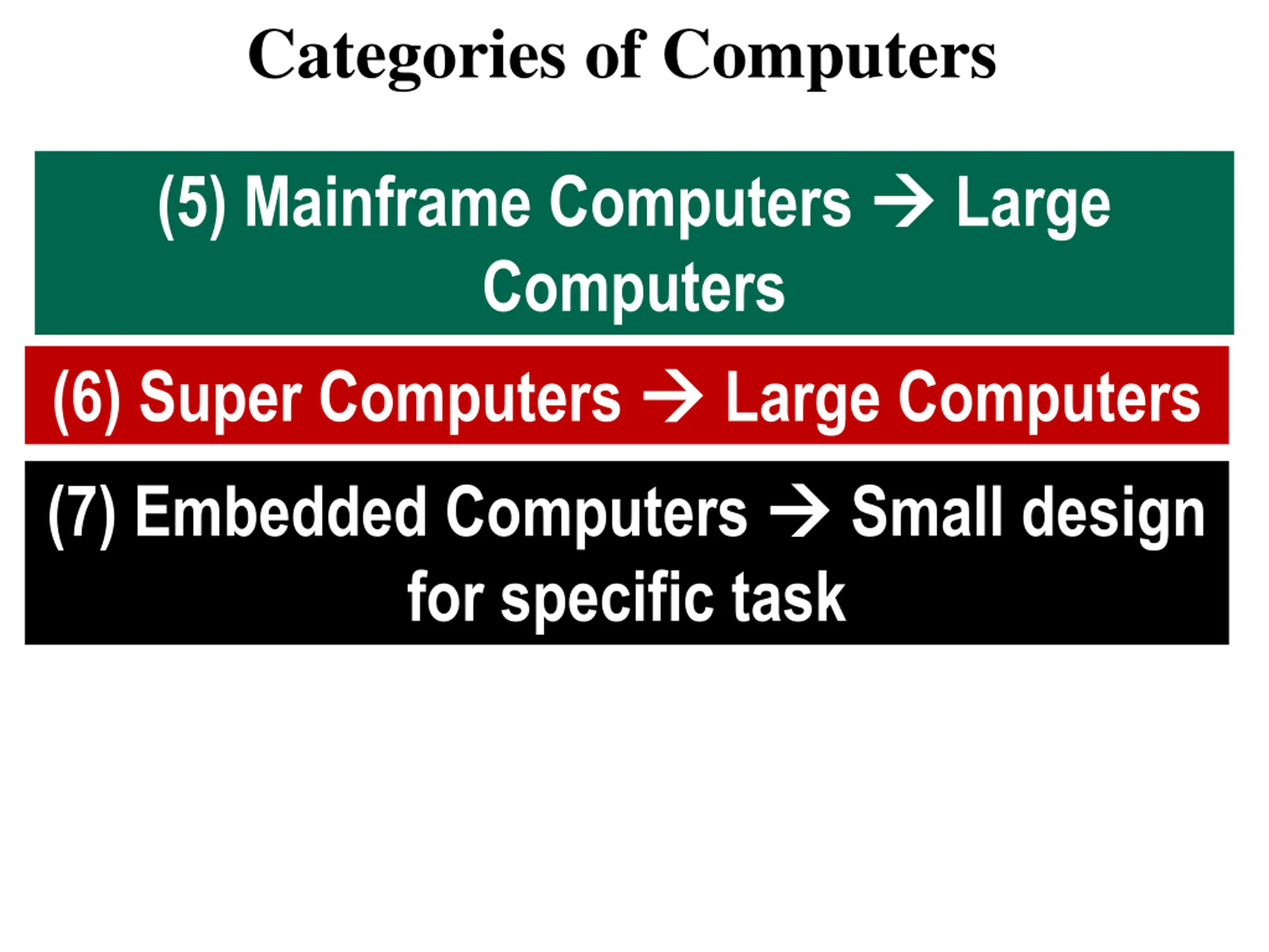 Categories of Computers (5) Mainframe Computers Computers Large (6) Super Computers (7) Embedded Computers for specific task Large Computers Small design