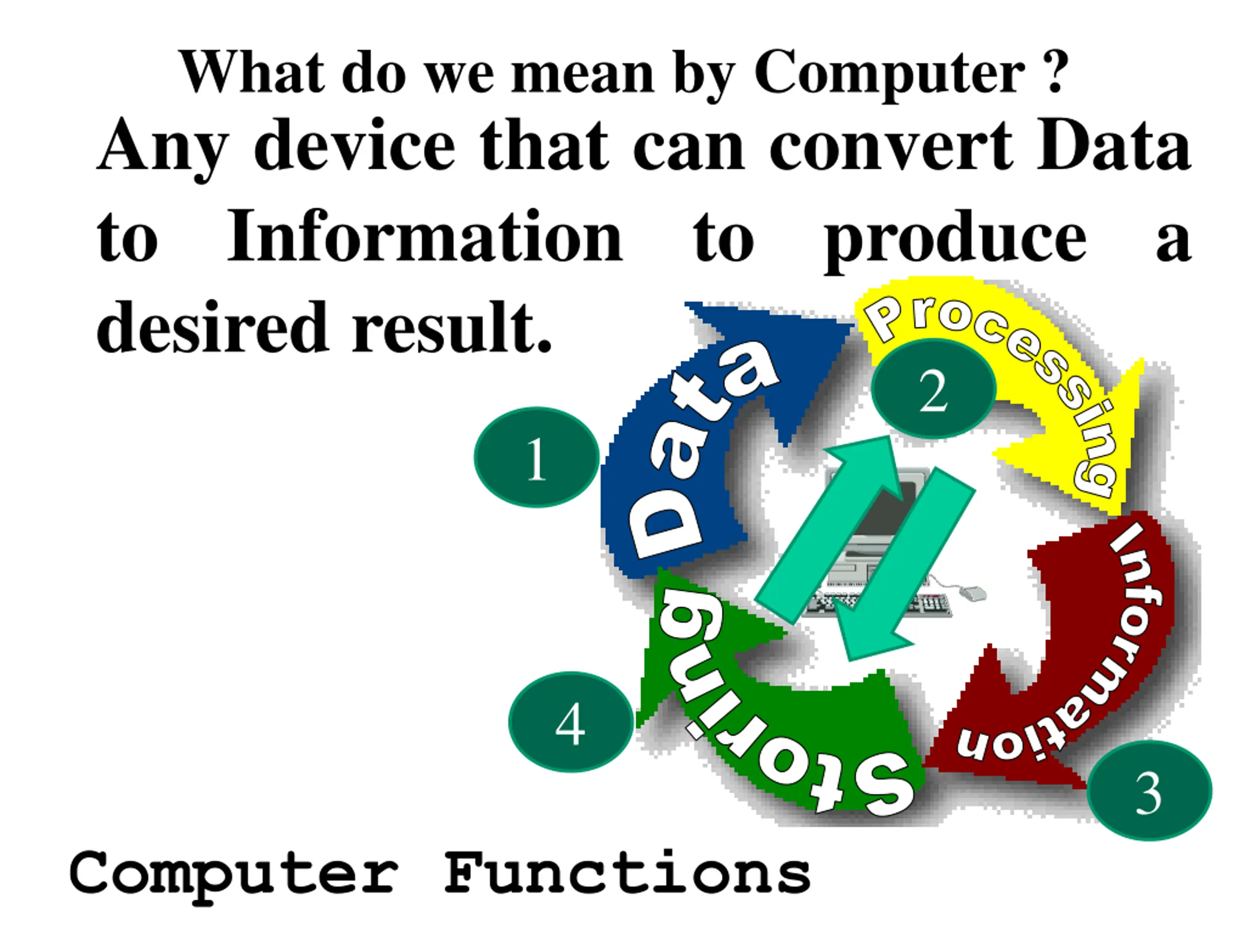 What do we mean by Computer ? Any device that can convert Data to Information to produce a desired result. Processing Data Information Storing 2 1 4 3 Computer Functions