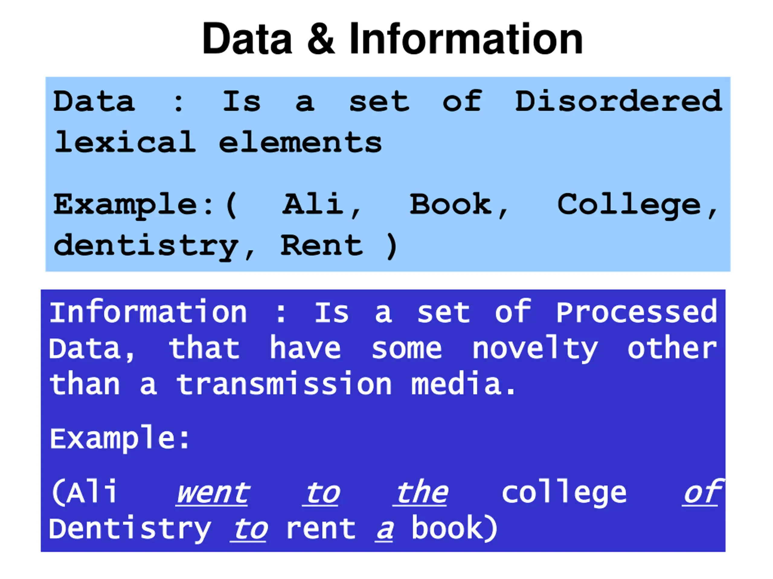 Data & Information Data : Is a set of Disordered lexical elements Example:( Ali, Book, College, dentistry, Rent ) Information : Is a set of Processed Information : Is a set of Processed Data, that have some novelty other Data, that have some novelty other than a transmission media. than a transmission media. Example: Example: (Ali (Ali Dentistry Dentistry to went went to to rent a a book) the the book) college college of of to rent