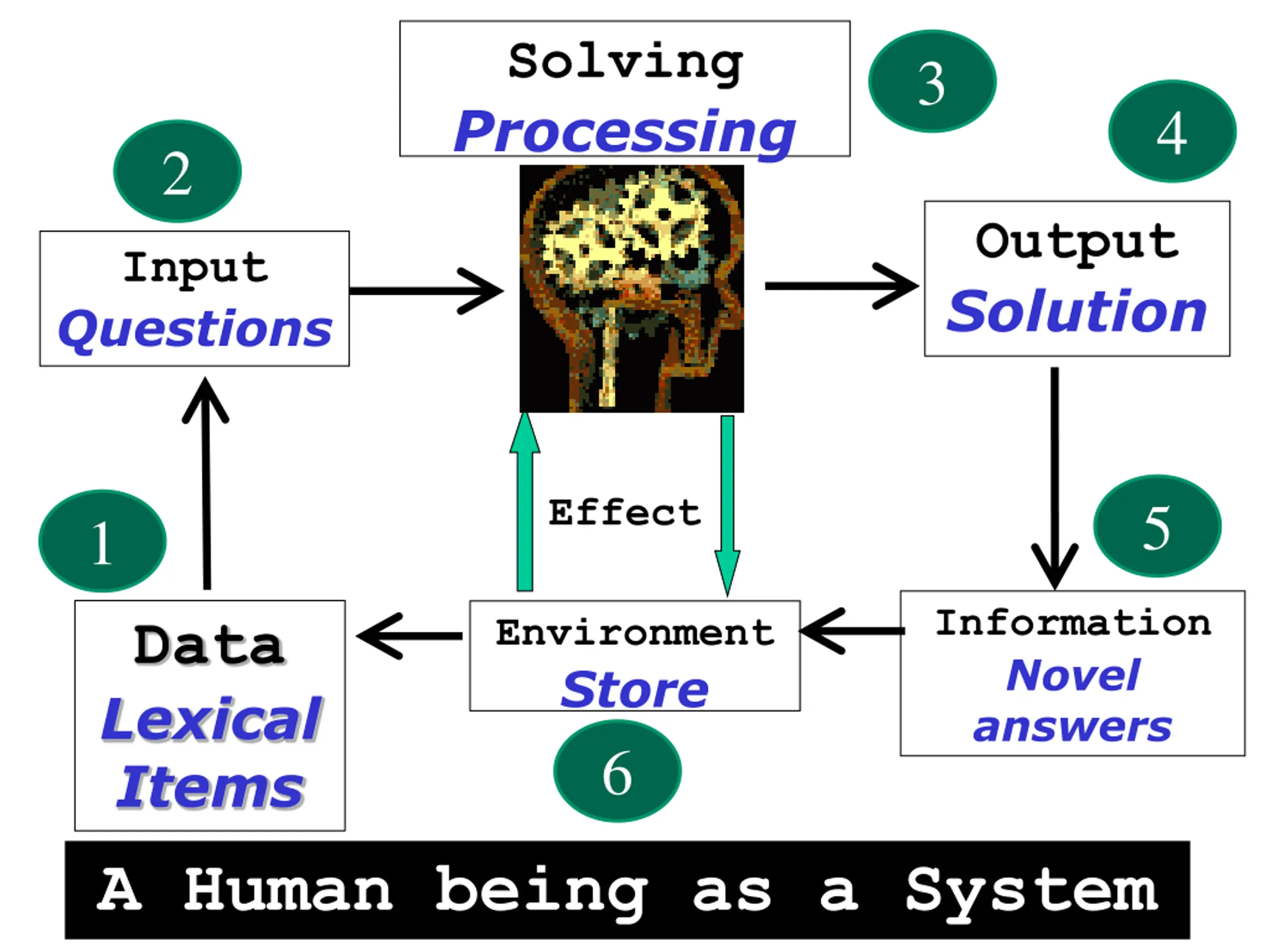 Solving Processing 3 4 2 Output Solution Input Questions Effect 5 1 Information Novel answers Environment Store 6 Data Lexical Items A Human being as a System