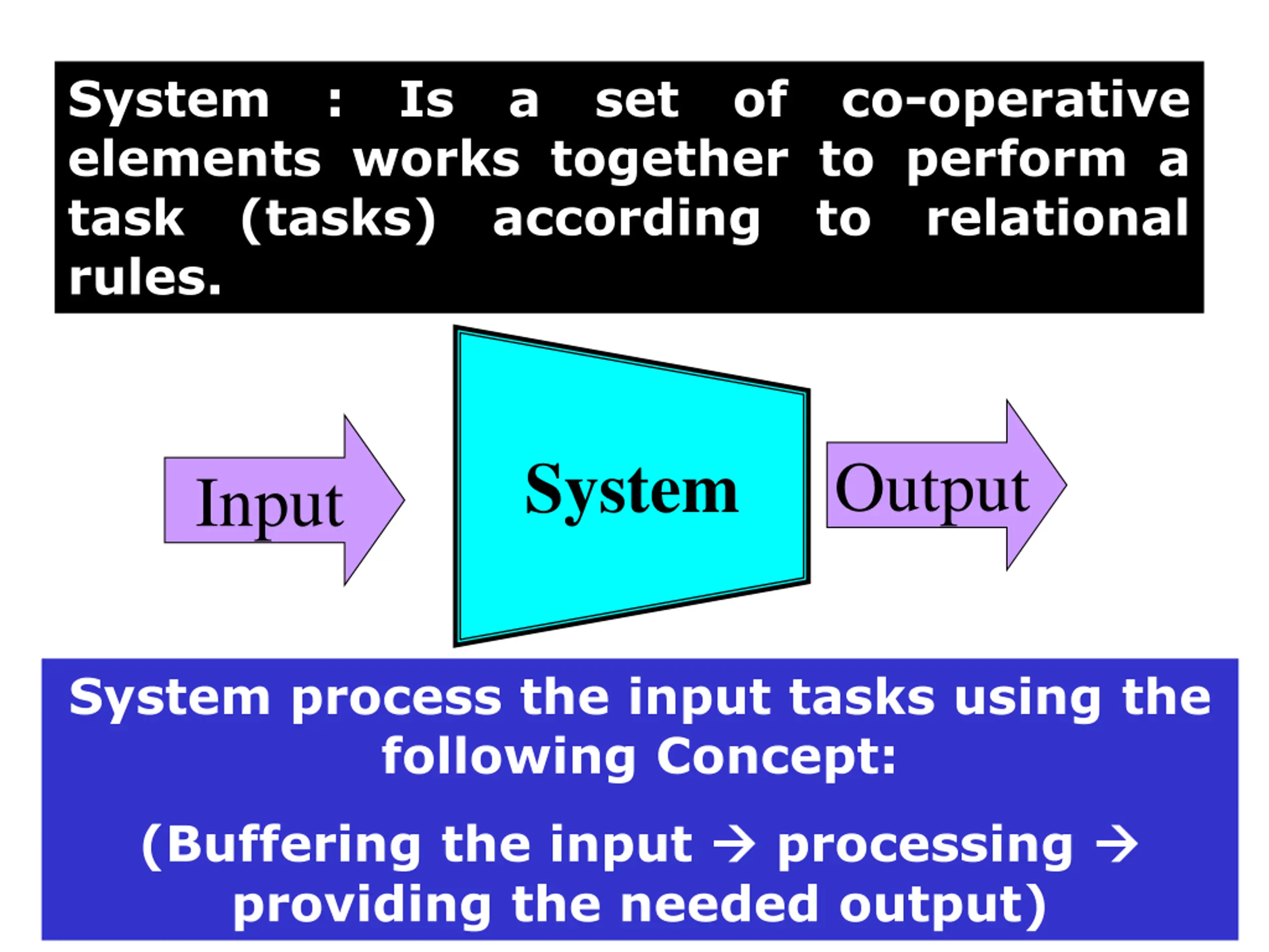 System : Is a set of co-operative elements works together to perform a task (tasks) according to relational rules. System Output Input System process the input tasks using the following Concept: (Buffering the input providing the needed output) processing