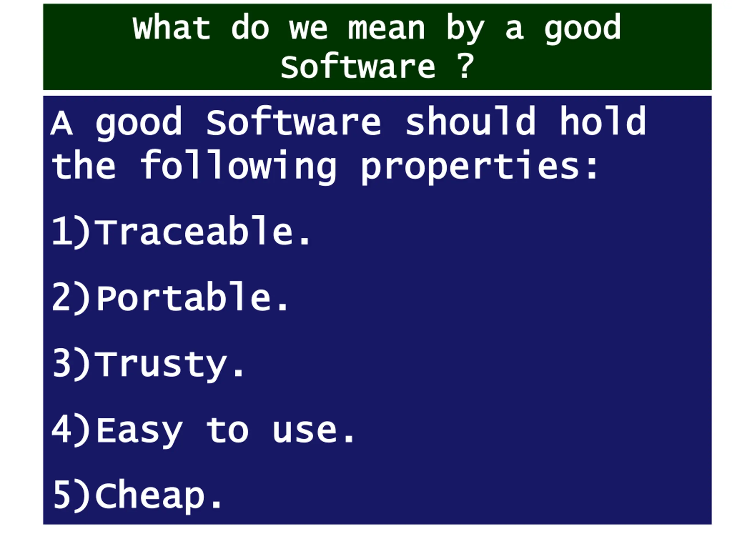 What do we mean by a good What do we mean by a good Software ? Software ? A A good Software good Software should hold the following properties: the following properties: should hold 1) 1)Traceable. Traceable. 2) 2)Portable. Portable. 3) 3)Trusty. Trusty. 4) 4)Easy to use. Easy to use. 5) 5)Cheap. Cheap.