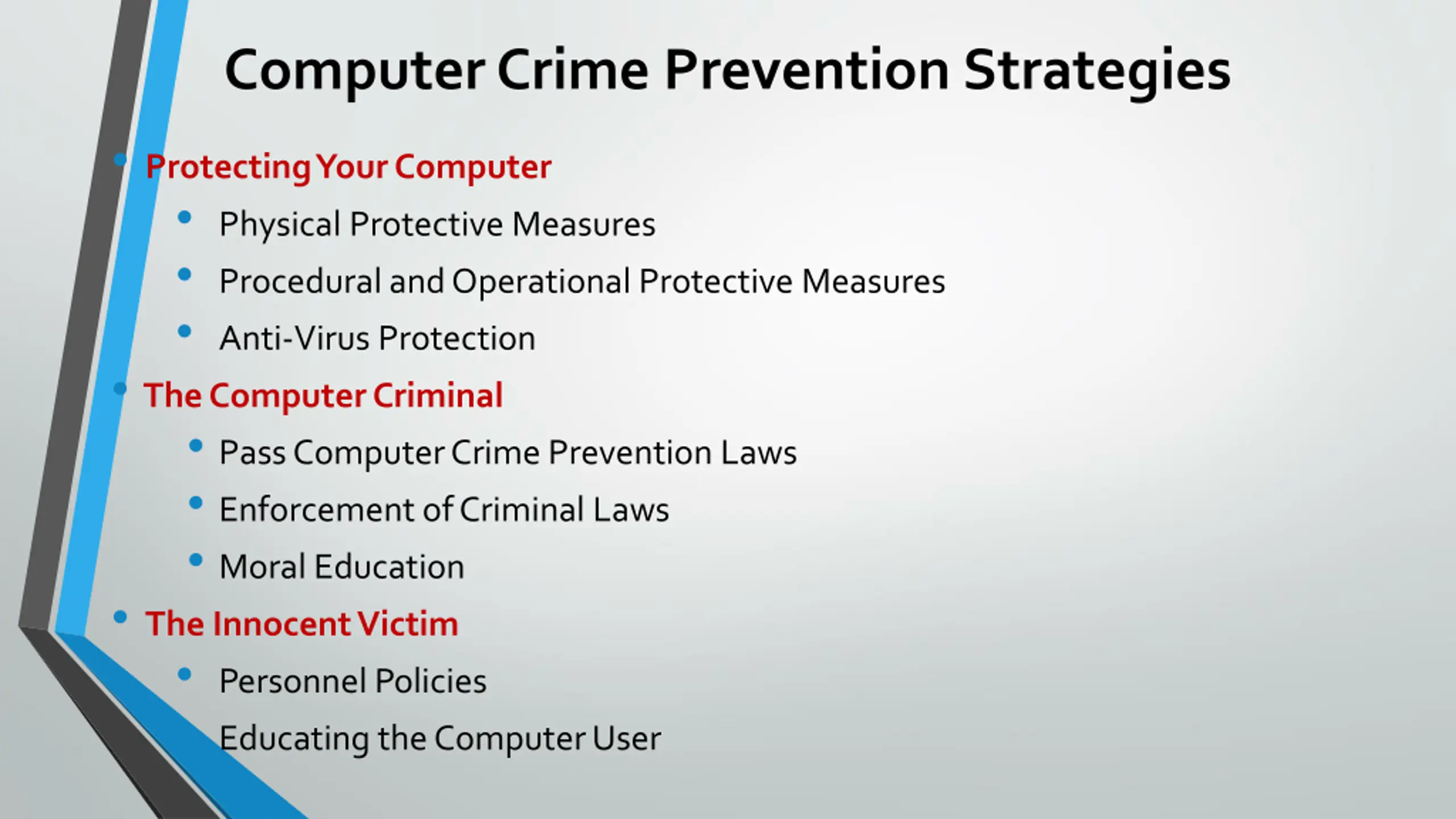 Computer Crime Prevention Strategies Protecting Your Computer Physical Protective Measures Procedural and Operational Protective Measures Anti-Virus Protection The Computer Criminal Pass Computer Crime Prevention Laws Enforcement of Criminal Laws Moral Education The Innocent Victim Personnel Policies Educating the Computer User