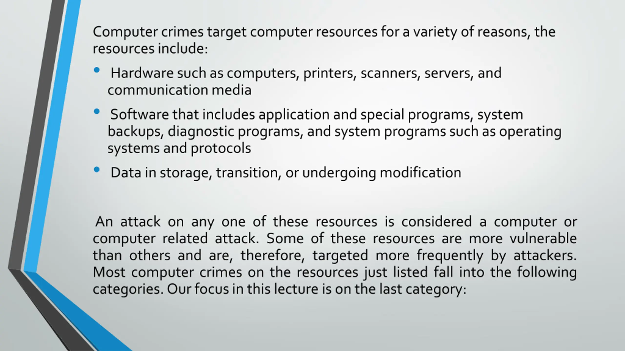 Computer crimes target computer resources for a variety of reasons, the resources include: Hardware such as computers, printers, scanners, servers, and communication media Software that includes application and special programs, system backups, diagnostic programs, and system programs such as operating systems and protocols Data in storage, transition, or undergoing modification An attack on any one of these resources is considered a computer or computer related attack. Some of these resources are more vulnerable than others and are, therefore, targeted more frequently by attackers. Most computer crimes on the resources just listed fall into the following categories. Our focus in this lecture is on the last category: