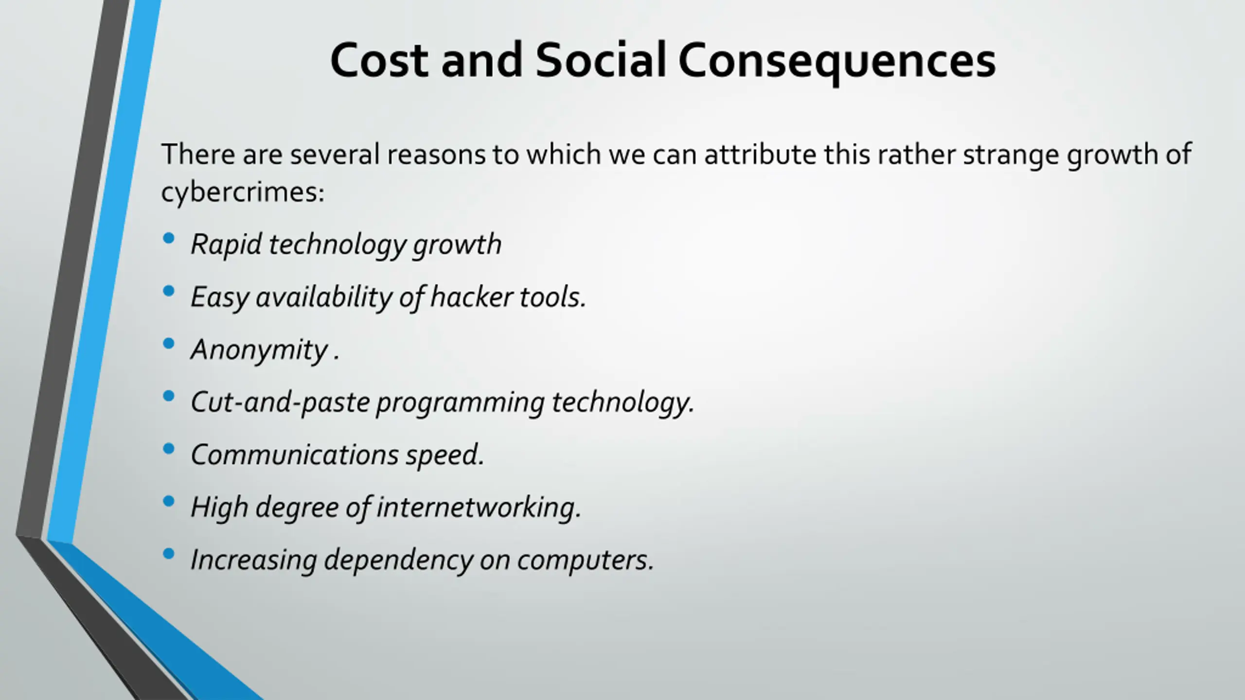 Cost and Social Consequences There are several reasons to which we can attribute this rather strange growth of cybercrimes: Rapid technology growth Easy availability of hacker tools. Anonymity . Cut-and-paste programming technology. Communications speed. High degree of internetworking. Increasing dependency on computers.
