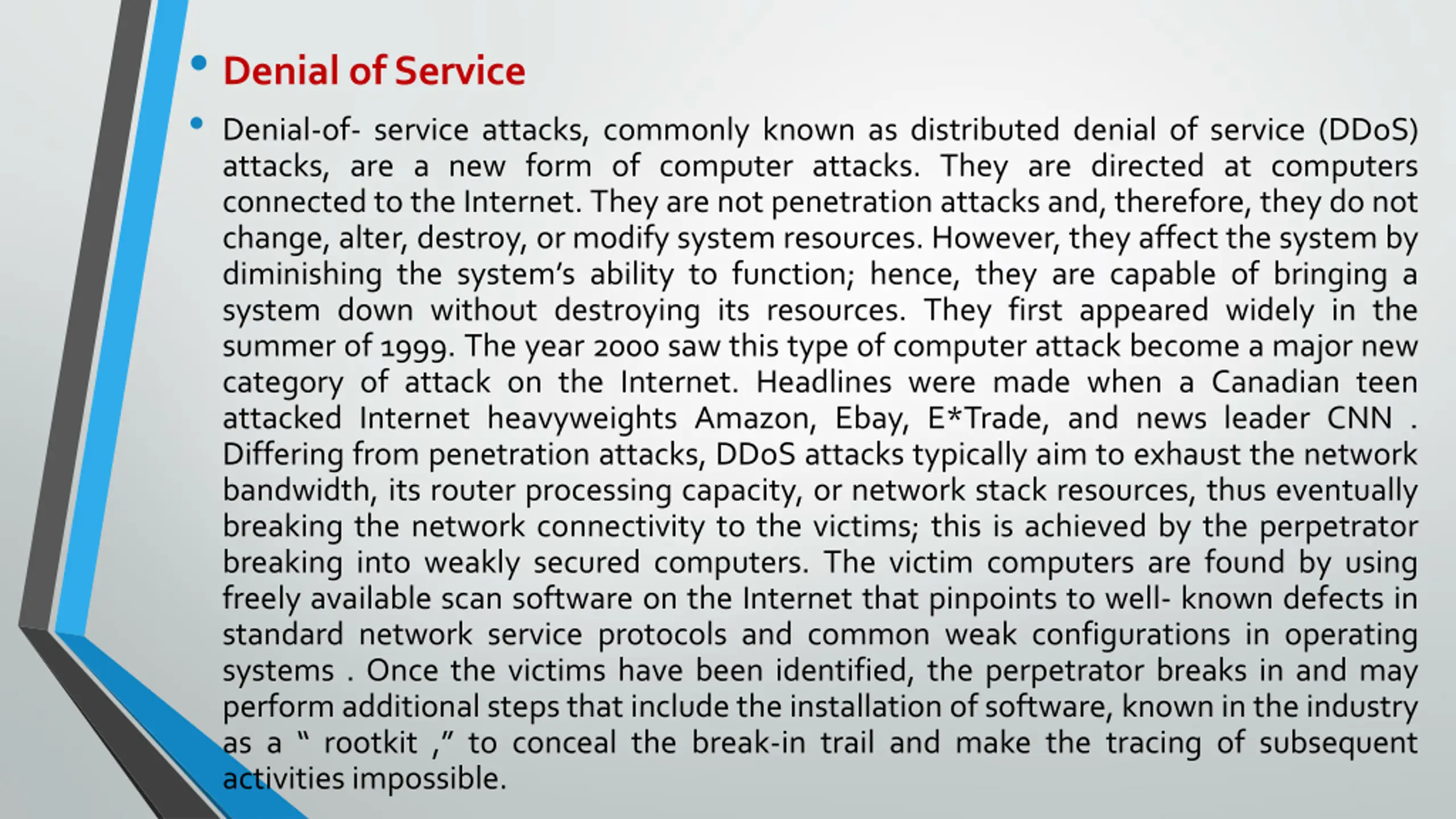 Denial of Service Denial-of- service attacks, commonly known as distributed denial of service (DDoS) attacks, are a new form of computer attacks. They are directed at computers connected to the Internet. They are not penetration attacks and, therefore, they do not change, alter, destroy, or modify system resources. However, they affect the system by diminishing the system s ability to function; hence, they are capable of bringing a system down without destroying its resources. They first appeared widely in the summer of 1999. The year 2000 saw this type of computer attack become a major new category of attack on the Internet. Headlines were made when a Canadian teen attacked Internet heavyweights Amazon, Ebay, E*Trade, and news leader CNN . Differing from penetration attacks, DDoS attacks typically aim to exhaust the network bandwidth, its router processing capacity, or network stack resources, thus eventually breaking the network connectivity to the victims; this is achieved by the perpetrator breaking into weakly secured computers. The victim computers are found by using freely available scan software on the Internet that pinpoints to well- known defects in standard network service protocols and common weak configurations in operating systems . Once the victims have been identified, the perpetrator breaks in and may perform additional steps that include the installation of software, known in the industry as a rootkit , to conceal the break-in trail and make the tracing of subsequent activities impossible.