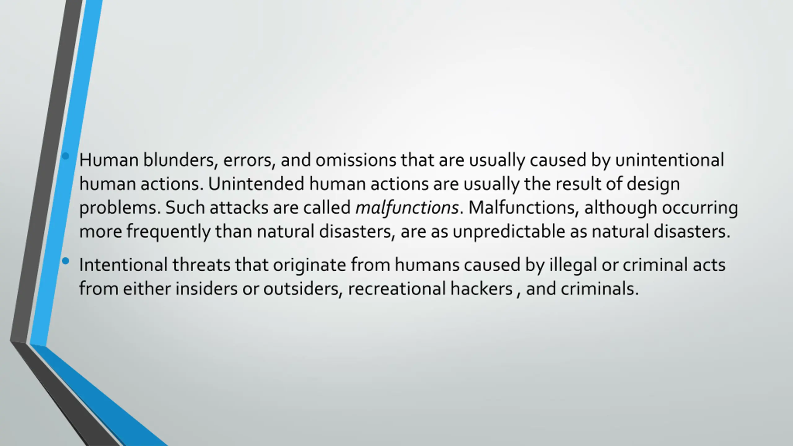 Human blunders, errors, and omissions that are usually caused by unintentional human actions. Unintended human actions are usually the result of design problems. Such attacks are called malfunctions. Malfunctions, although occurring more frequently than natural disasters, are as unpredictable as natural disasters. Intentional threats that originate from humans caused by illegal or criminal acts from either insiders or outsiders, recreational hackers , and criminals.