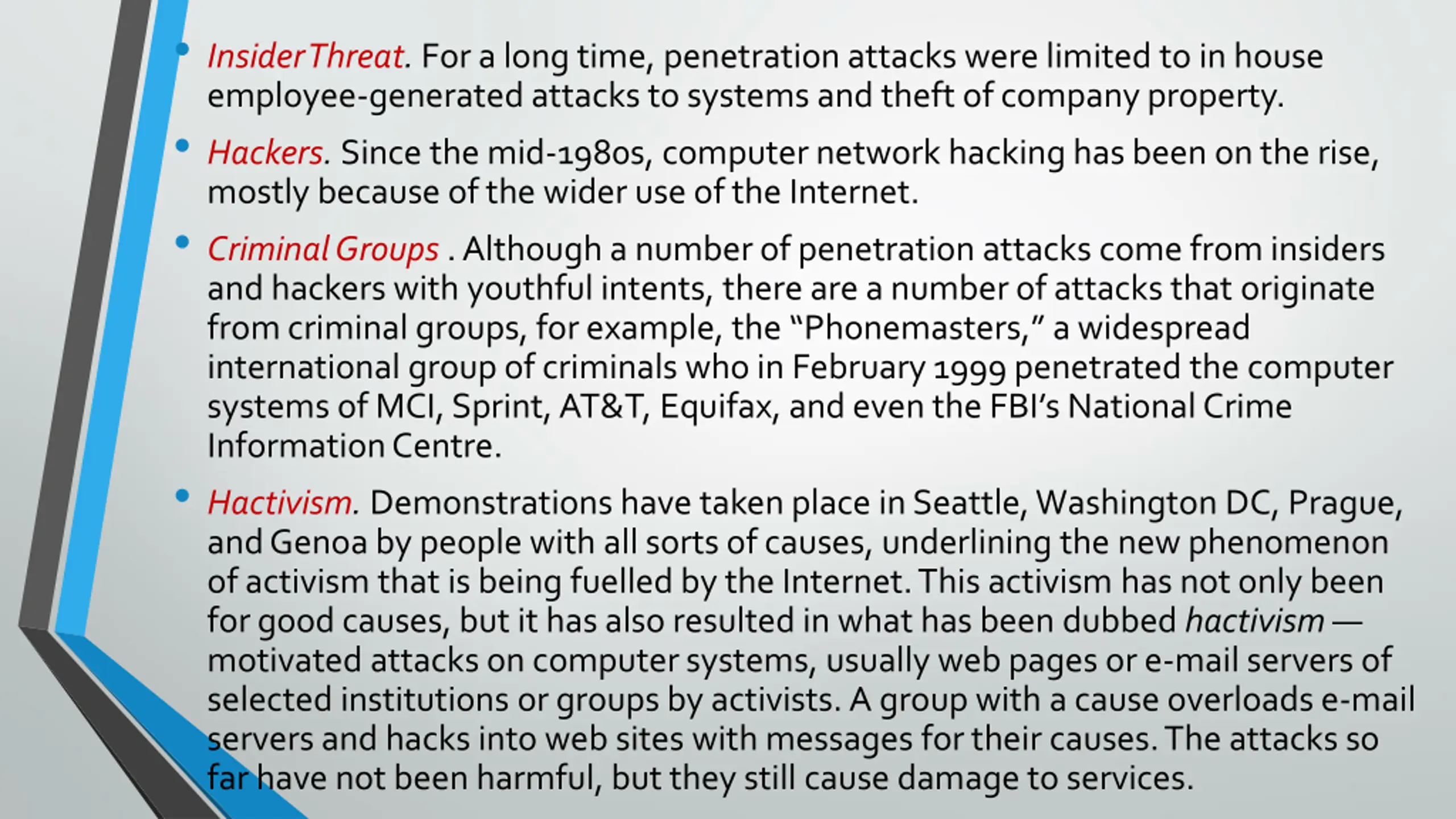 Insider Threat. For a long time, penetration attacks were limited to in house employee-generated attacks to systems and theft of company property. Hackers. Since the mid-1980s, computer network hacking has been on the rise, mostly because of the wider use of the Internet. Criminal Groups . Although a number of penetration attacks come from insiders and hackers with youthful intents, there are a number of attacks that originate from criminal groups, for example, the Phonemasters, a widespread international group of criminals who in February 1999 penetrated the computer systems of MCI, Sprint, AT&T, Equifax, and even the FBI s National Crime Information Centre. Hactivism. Demonstrations have taken place in Seattle, Washington DC, Prague, and Genoa by people with all sorts of causes, underlining the new phenomenon of activism that is being fuelled by the Internet. This activism has not only been for good causes, but it has also resulted in what has been dubbed hactivism motivated attacks on computer systems, usually web pages or e-mail servers of selected institutions or groups by activists. A group with a cause overloads e-mail servers and hacks into web sites with messages for their causes. The attacks so far have not been harmful, but they still cause damage to services.