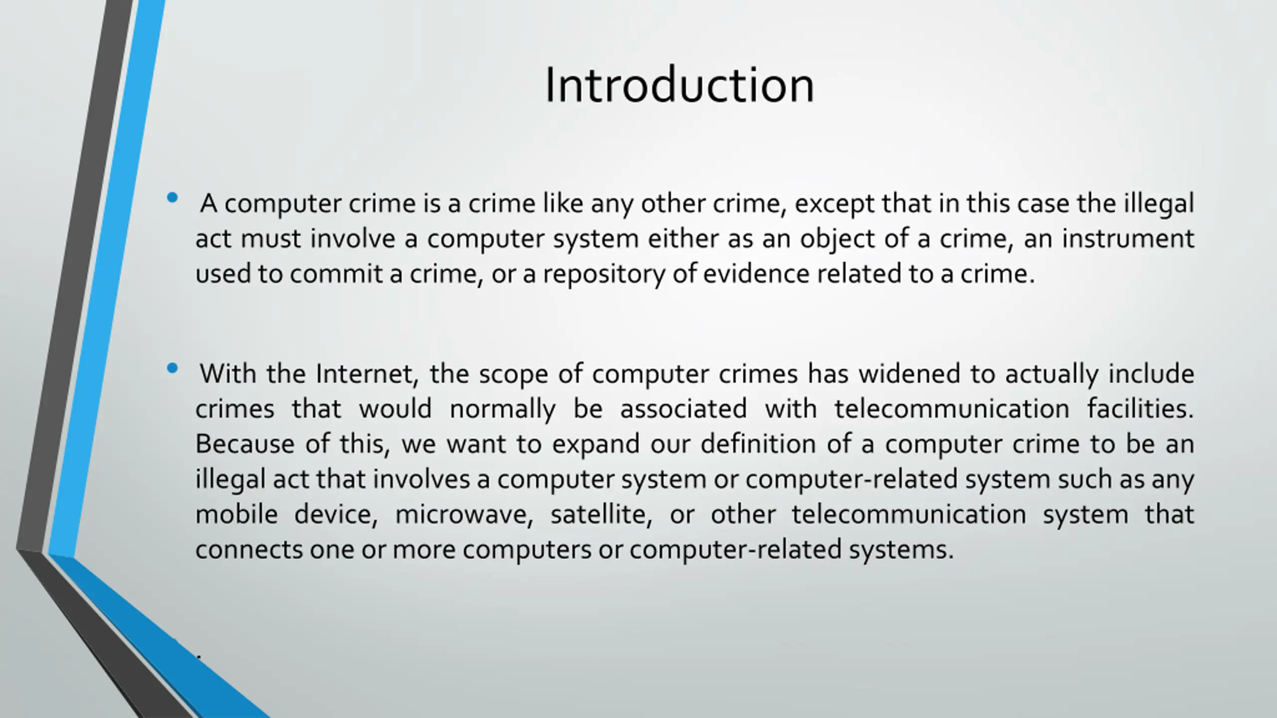 Introduction A computer crime is a crime like any other crime, except that in this case the illegal act must involve a computer system either as an object of a crime, an instrument used to commit a crime, or a repository of evidence related to a crime. With the Internet, the scope of computer crimes has widened to actually include crimes that would normally be associated with telecommunication facilities. Because of this, we want to expand our definition of a computer crime to be an illegal act that involves a computer system or computer-related system such as any mobile device, microwave, satellite, or other telecommunication system that connects one or more computers or computer-related systems. .