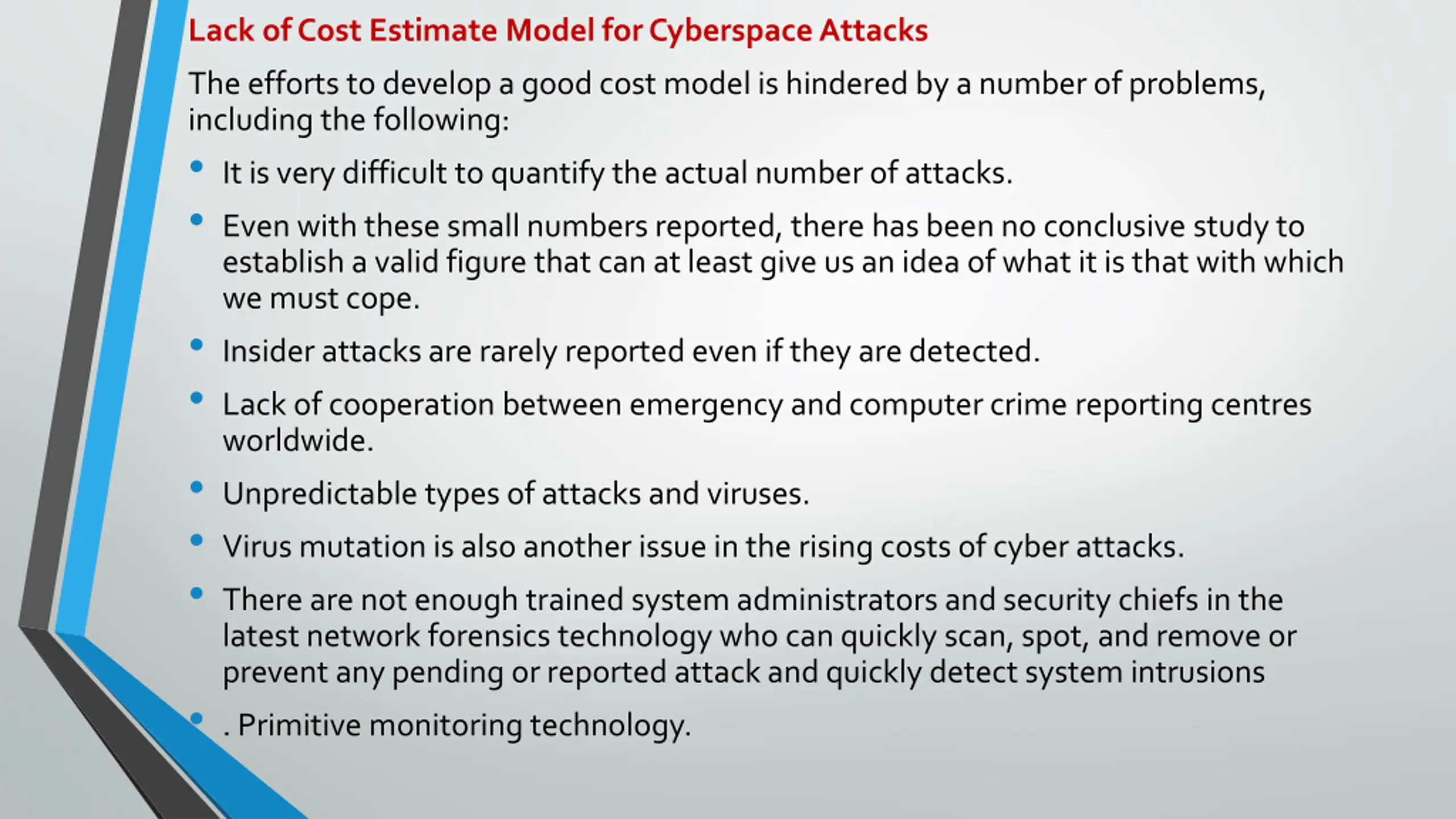 Lack of Cost Estimate Model for Cyberspace Attacks The efforts to develop a good cost model is hindered by a number of problems, including the following: It is very difficult to quantify the actual number of attacks. Even with these small numbers reported, there has been no conclusive study to establish a valid figure that can at least give us an idea of what it is that with which we must cope. Insider attacks are rarely reported even if they are detected. Lack of cooperation between emergency and computer crime reporting centres worldwide. Unpredictable types of attacks and viruses. Virus mutation is also another issue in the rising costs of cyber attacks. There are not enough trained system administrators and security chiefs in the latest network forensics technology who can quickly scan, spot, and remove or prevent any pending or reported attack and quickly detect system intrusions . Primitive monitoring technology.