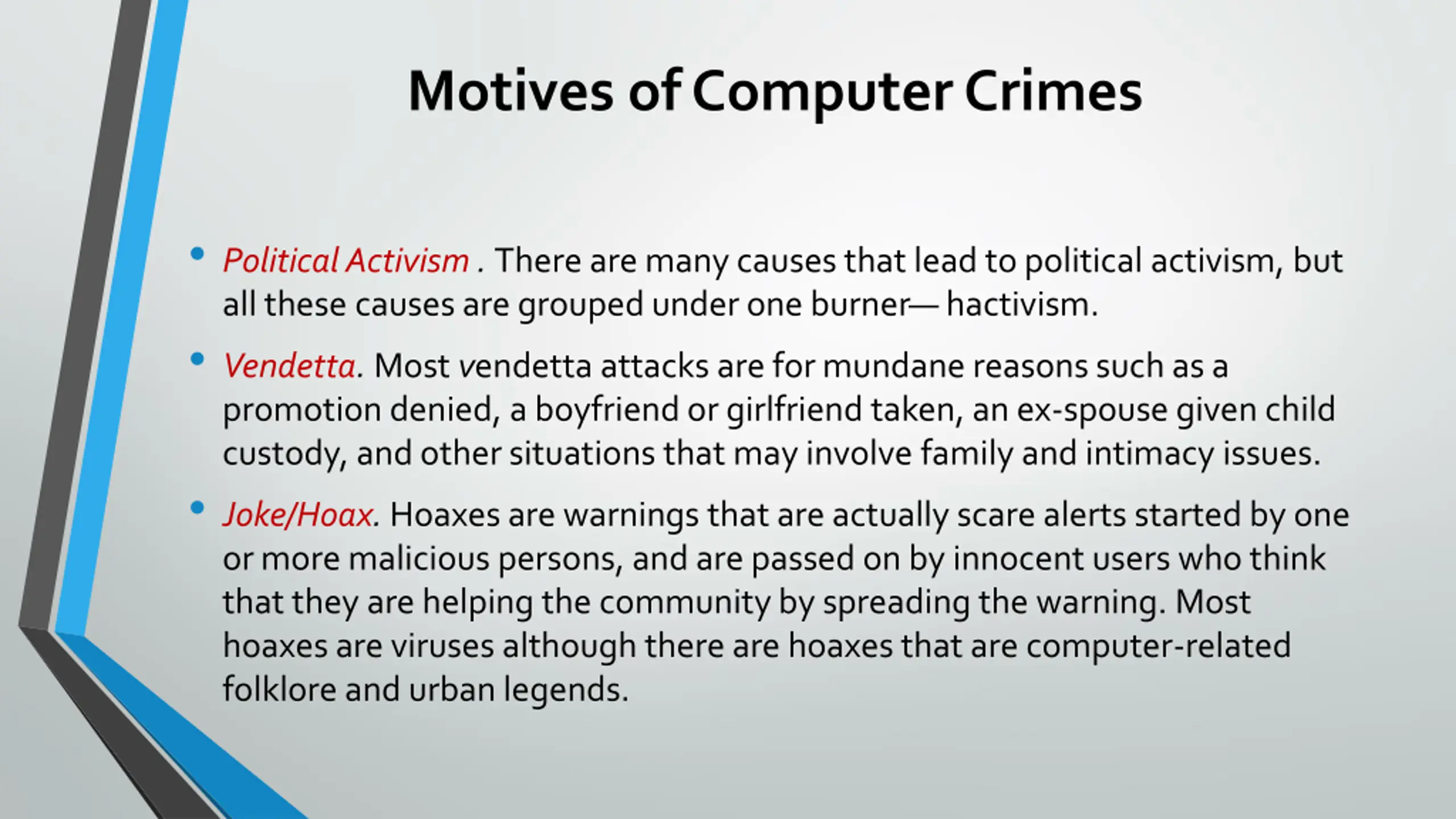 Motives of Computer Crimes Political Activism . There are many causes that lead to political activism, but all these causes are grouped under one burner hactivism. Vendetta. Most vendetta attacks are for mundane reasons such as a promotion denied, a boyfriend or girlfriend taken, an ex-spouse given child custody, and other situations that may involve family and intimacy issues. Joke/Hoax. Hoaxes are warnings that are actually scare alerts started by one or more malicious persons, and are passed on by innocent users who think that they are helping the community by spreading the warning. Most hoaxes are viruses although there are hoaxes that are computer-related folklore and urban legends.