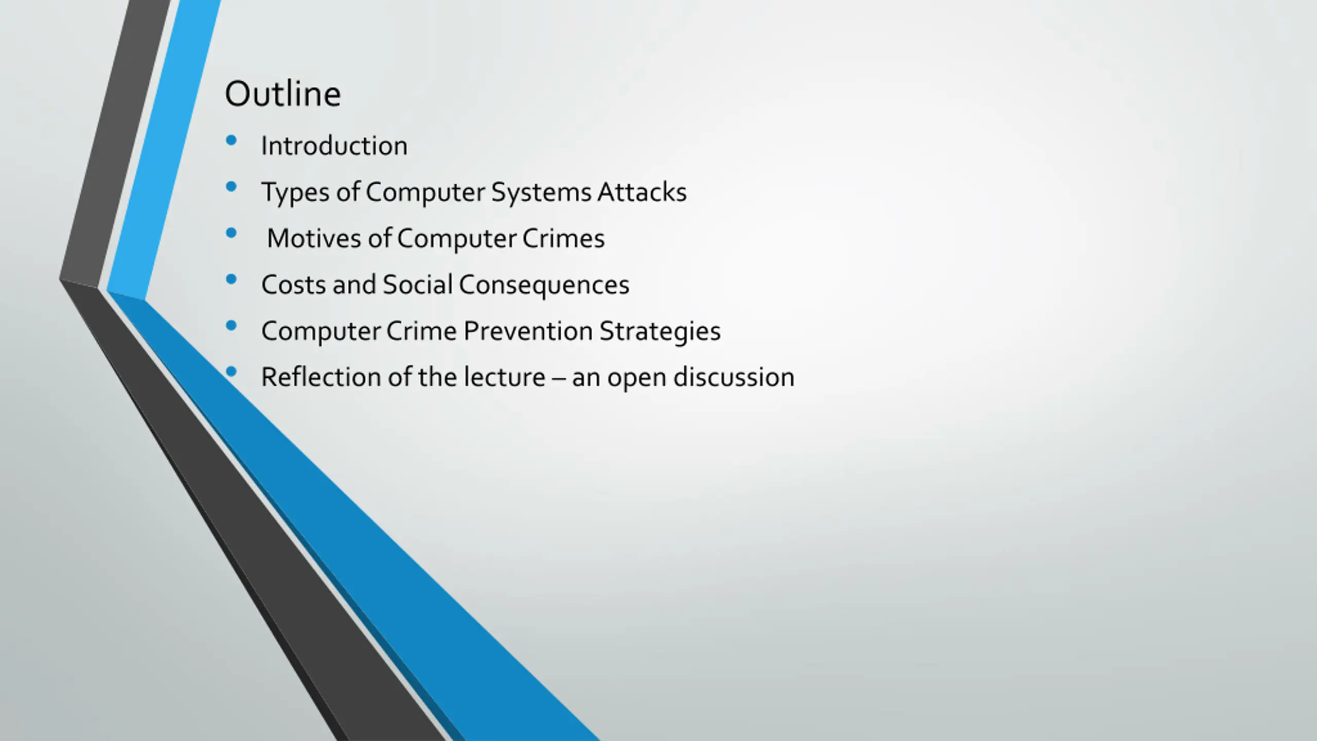 Outline Introduction Types of Computer Systems Attacks Motives of Computer Crimes Costs and Social Consequences Computer Crime Prevention Strategies Reflection of the lecture an open discussion
