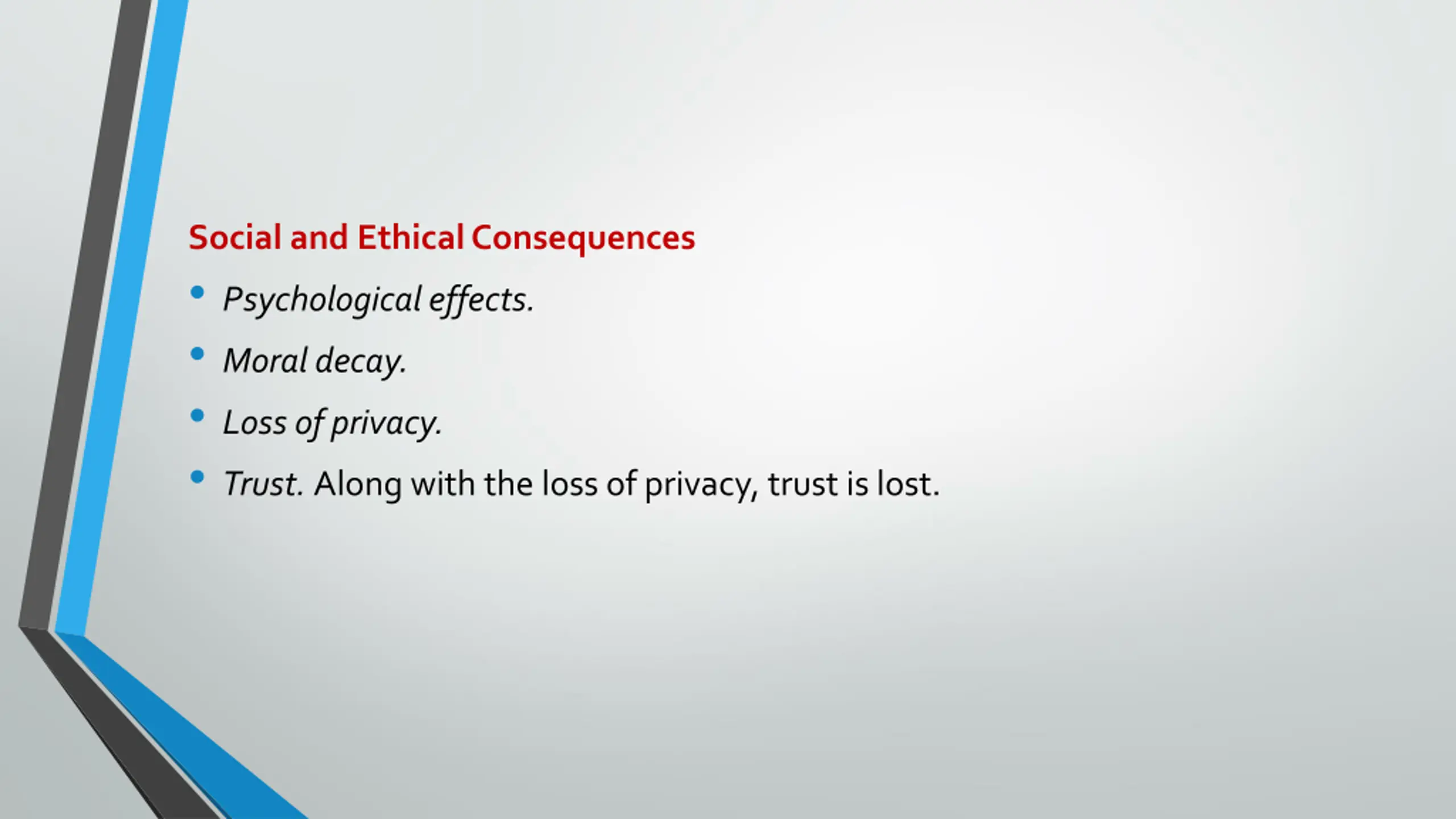 Social and Ethical Consequences Psychological effects. Moral decay. Loss of privacy. Trust. Along with the loss of privacy, trust is lost.