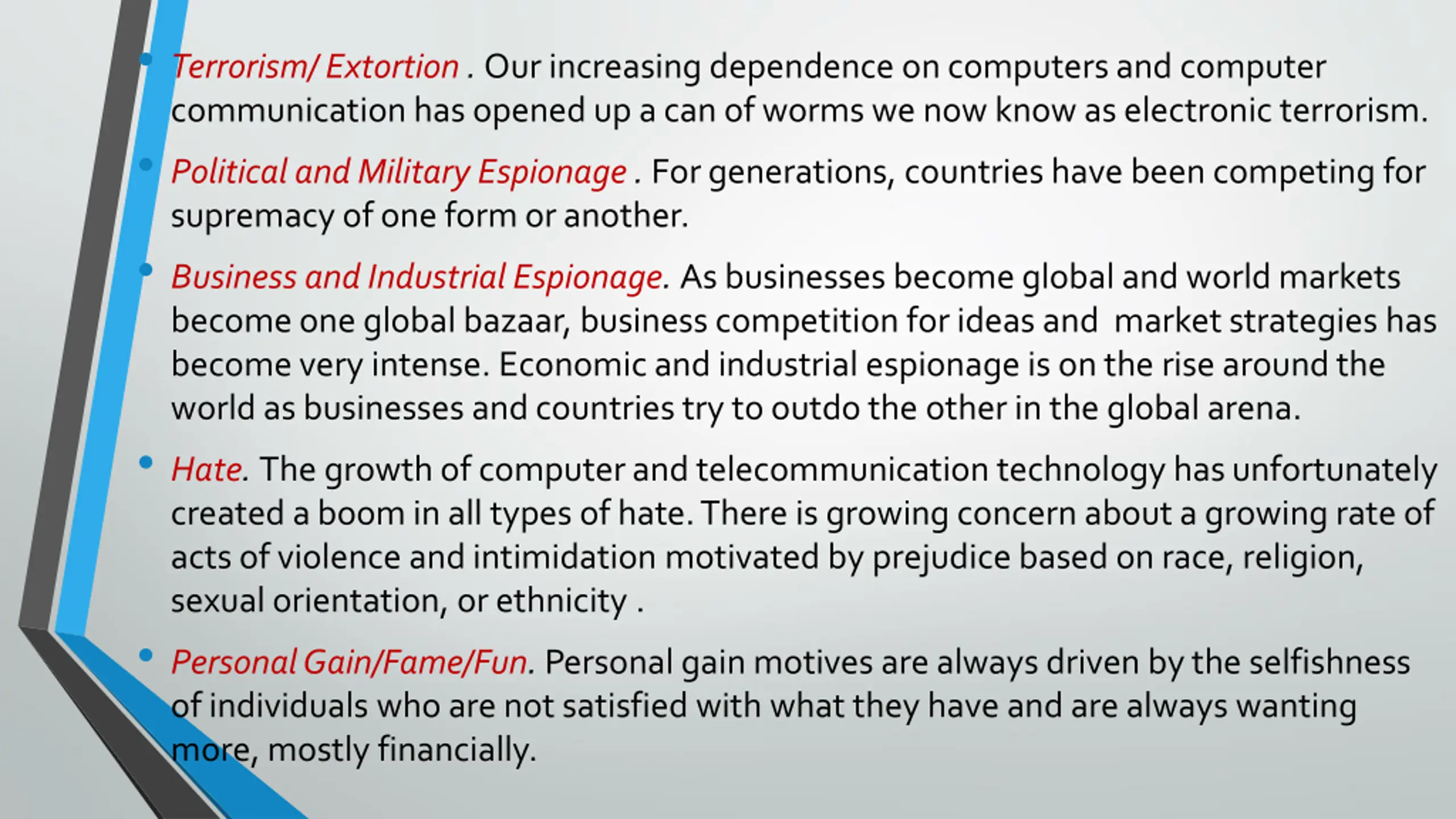 Terrorism/ Extortion . Our increasing dependence on computers and computer communication has opened up a can of worms we now know as electronic terrorism. Political and Military Espionage . For generations, countries have been competing for supremacy of one form or another. Business and Industrial Espionage. As businesses become global and world markets become one global bazaar, business competition for ideas and market strategies has become very intense. Economic and industrial espionage is on the rise around the world as businesses and countries try to outdo the other in the global arena. Hate. The growth of computer and telecommunication technology has unfortunately created a boom in all types of hate. There is growing concern about a growing rate of acts of violence and intimidation motivated by prejudice based on race, religion, sexual orientation, or ethnicity . Personal Gain/Fame/Fun. Personal gain motives are always driven by the selfishness of individuals who are not satisfied with what they have and are always wanting more, mostly financially.