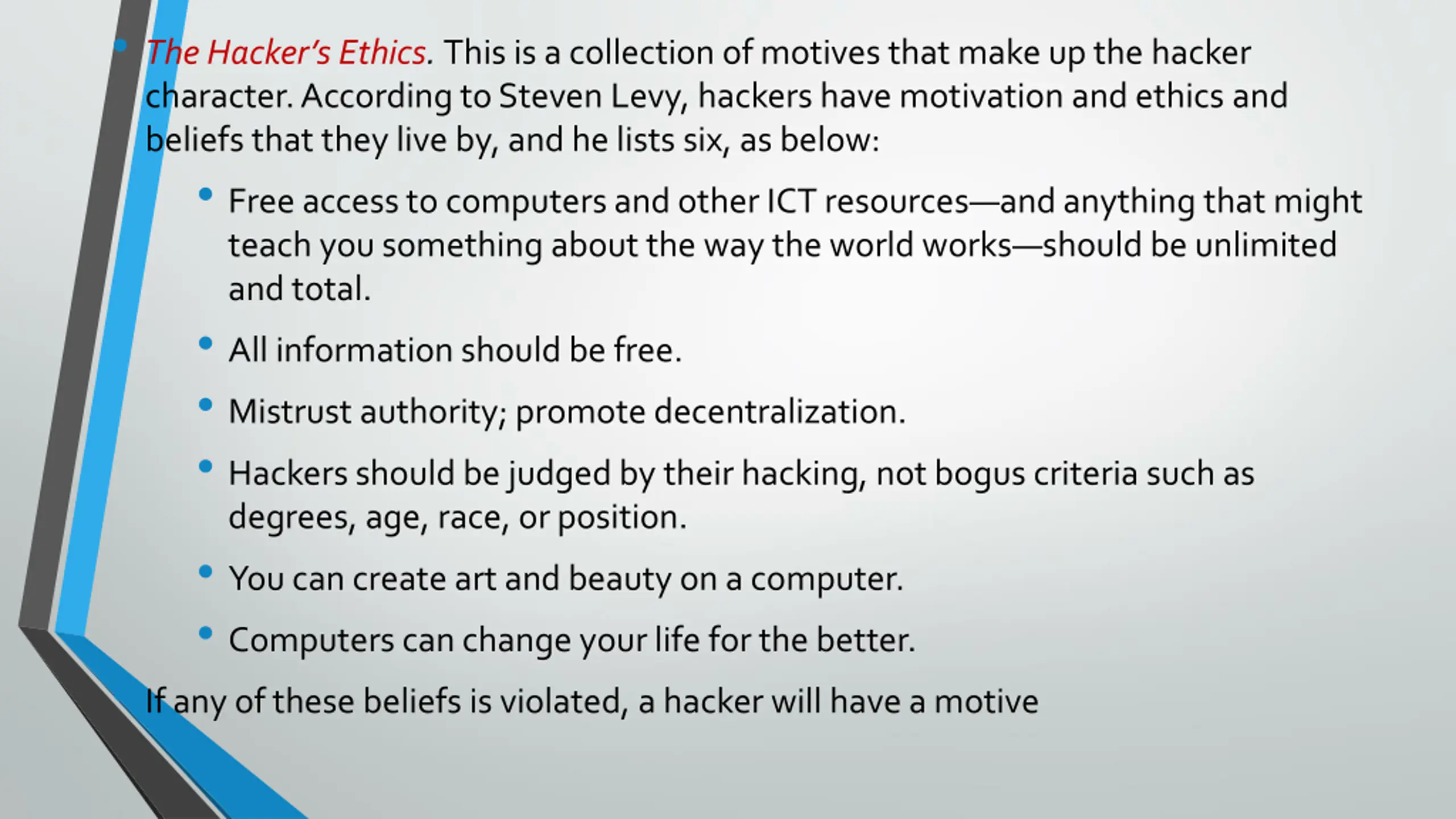 The Hackers Ethics. This is a collection of motives that make up the hacker character. According to Steven Levy, hackers have motivation and ethics and beliefs that they live by, and he lists six, as below: Free access to computers and other ICT resources and anything that might teach you something about the way the world works should be unlimited and total. All information should be free. Mistrust authority; promote decentralization. Hackers should be judged by their hacking, not bogus criteria such as degrees, age, race, or position. You can create art and beauty on a computer. Computers can change your life for the better. If any of these beliefs is violated, a hacker will have a motive