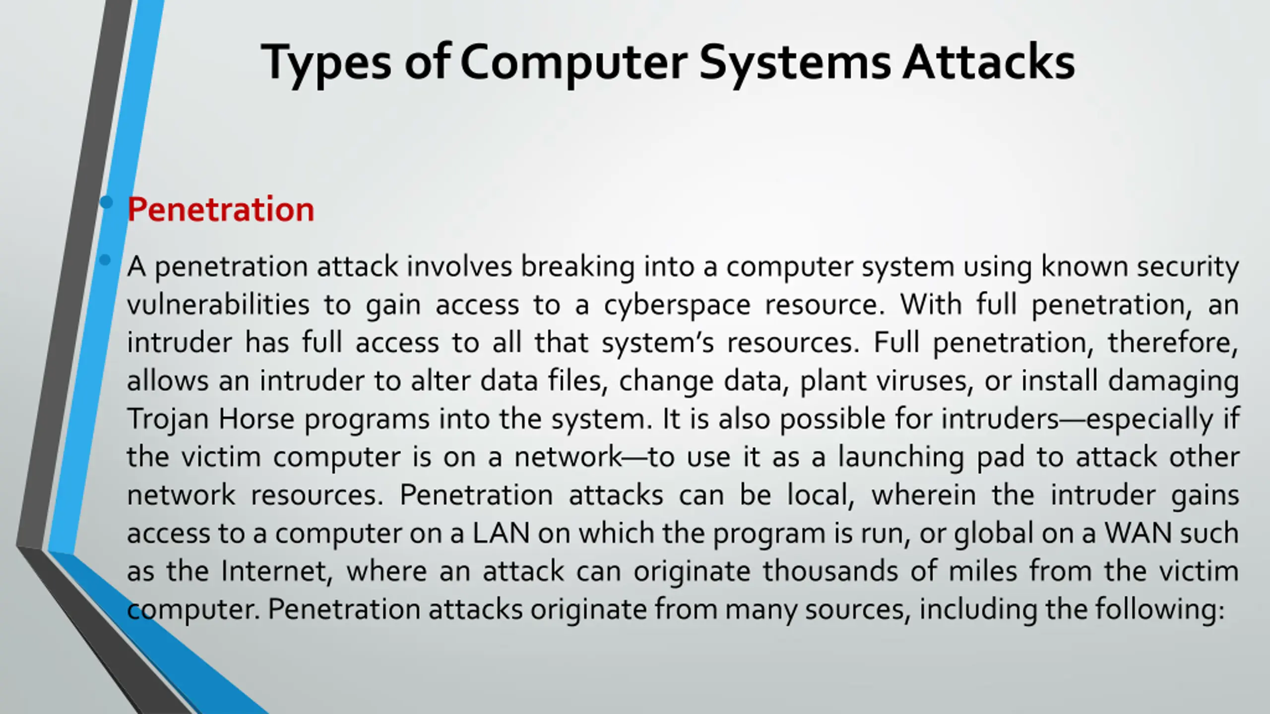 Types of Computer Systems Attacks Penetration A penetration attack involves breaking into a computer system using known security vulnerabilities to gain access to a cyberspace resource. With full penetration, an intruder has full access to all that system s resources. Full penetration, therefore, allows an intruder to alter data files, change data, plant viruses, or install damaging Trojan Horse programs into the system. It is also possible for intruders especially if the victim computer is on a network to use it as a launching pad to attack other network resources. Penetration attacks can be local, wherein the intruder gains access to a computer on a LAN on which the program is run, or global on a WAN such as the Internet, where an attack can originate thousands of miles from the victim computer. Penetration attacks originate from many sources, including the following: