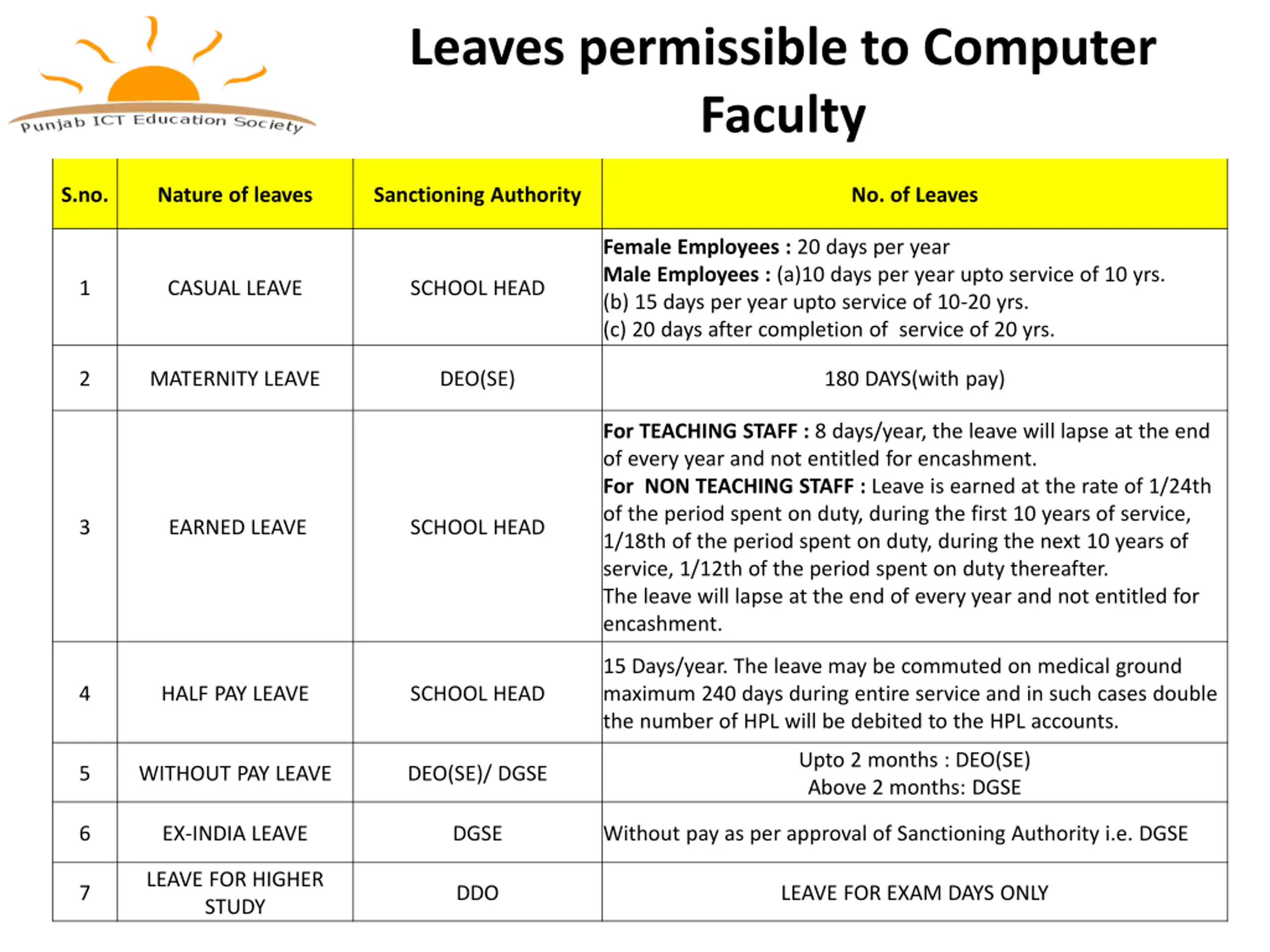 Leaves permissible to Computer Faculty S.no. Nature of leaves Sanctioning Authority No. of Leaves Female Employees : 20 days per year Male Employees : (a)10 days per year upto service of 10 yrs. (b) 15 days per year upto service of 10-20 yrs. (c) 20 days after completion of service of 20 yrs. 1 CASUAL LEAVE SCHOOL HEAD 2 MATERNITY LEAVE DEO(SE) 180 DAYS(with pay) For TEACHING STAFF : 8 days/year, the leave will lapse at the end of every year and not entitled for encashment. For NON TEACHING STAFF : Leave is earned at the rate of 1/24th of the period spent on duty, during the first 10 years of service, 1/18th of the period spent on duty, during the next 10 years of service, 1/12th of the period spent on duty thereafter. The leave will lapse at the end of every year and not entitled for encashment. 3 EARNED LEAVE SCHOOL HEAD 15 Days/year. The leave may be commuted on medical ground maximum 240 days during entire service and in such cases double the number of HPL will be debited to the HPL accounts. 4 HALF PAY LEAVE SCHOOL HEAD Upto 2 months : DEO(SE) Above 2 months: DGSE 5 WITHOUT PAY LEAVE DEO(SE)/ DGSE 6 EX-INDIA LEAVE DGSE Without pay as per approval of Sanctioning Authority i.e. DGSE LEAVE FOR HIGHER STUDY 7 DDO LEAVE FOR EXAM DAYS ONLY