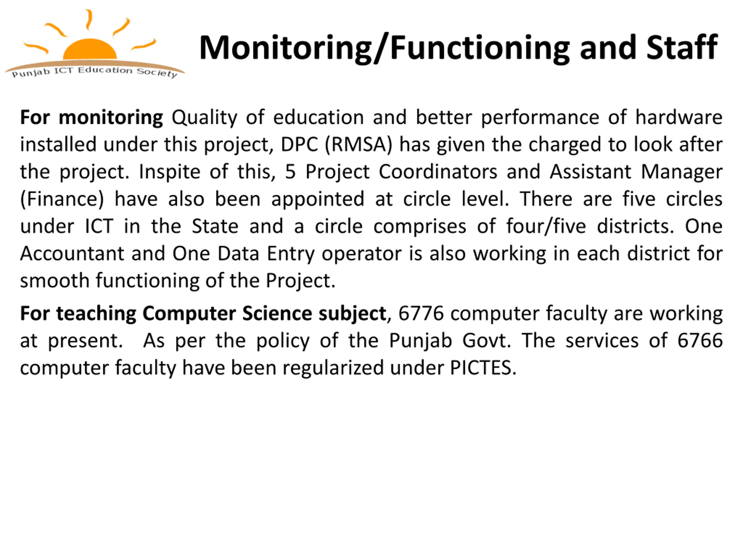 Monitoring/Functioning and Staff For monitoring Quality of education and better performance of hardware installed under this project, DPC (RMSA) has given the charged to look after the project. Inspite of this, 5 Project Coordinators and Assistant Manager (Finance) have also been appointed at circle level. There are five circles under ICT in the State and a circle comprises of four/five districts. One Accountant and One Data Entry operator is also working in each district for smooth functioning of the Project. For teaching Computer Science subject, 6776 computer faculty are working at present. As per the policy of the Punjab Govt. The services of 6766 computer faculty have been regularized under PICTES.