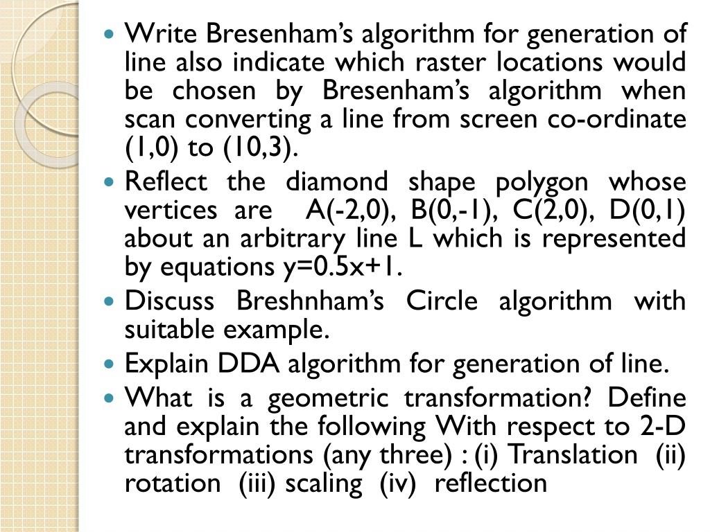 Write Bresenhams algorithm for generation of line also indicate which raster locations would be chosen by Bresenham s algorithm when scan converting a line from screen co-ordinate (1,0) to (10,3). Reflect the diamond shape polygon whose vertices are A(-2,0), B(0,-1), C(2,0), D(0,1) about an arbitrary line L which is represented by equations y=0.5x+1. Discuss Breshnham s Circle algorithm with suitable example. Explain DDA algorithm for generation of line. What is a geometric transformation? Define and explain the following With respect to 2-D transformations (any three) :(i) Translation (ii) rotation (iii) scaling (iv) reflection