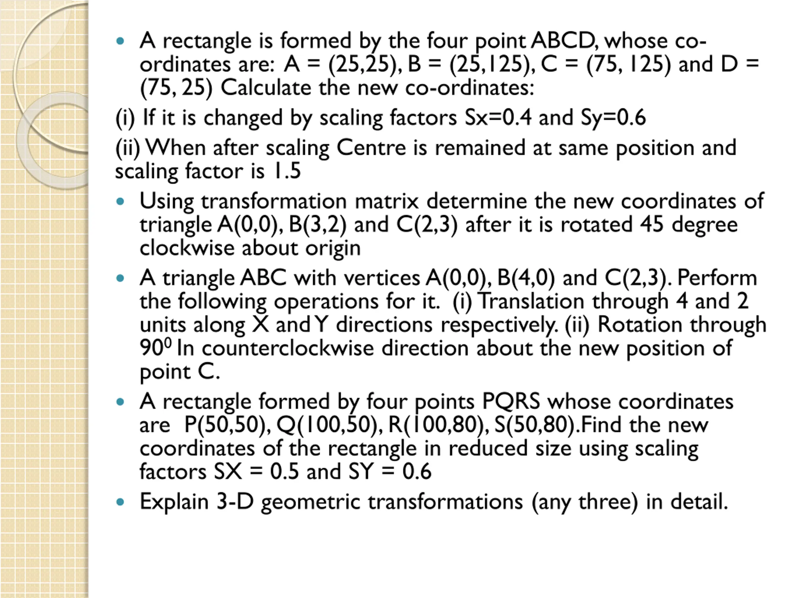 A rectangle is formed by the four point ABCD, whose co- ordinates are: A = (25,25), B = (25,125), C = (75, 125) and D = (75, 25) Calculate the new co-ordinates: (i) If it is changed by scaling factors Sx=0.4 and Sy=0.6 (ii) When after scaling Centre is remained at same position and scaling factor is 1.5 Using transformation matrix determine the new coordinates of triangle A(0,0), B(3,2) and C(2,3) after it is rotated 45 degree clockwise about origin A triangle ABC with vertices A(0,0), B(4,0) and C(2,3). Perform the following operations for it. (i) Translation through 4 and 2 units along X and Y directions respectively. (ii) Rotation through 900 In counterclockwise direction about the new position of point C. A rectangle formed by four points PQRS whose coordinates are P(50,50), Q(100,50), R(100,80), S(50,80).Find the new coordinates of the rectangle in reduced size using scaling factors SX = 0.5 and SY = 0.6 Explain 3-D geometric transformations (any three) in detail.