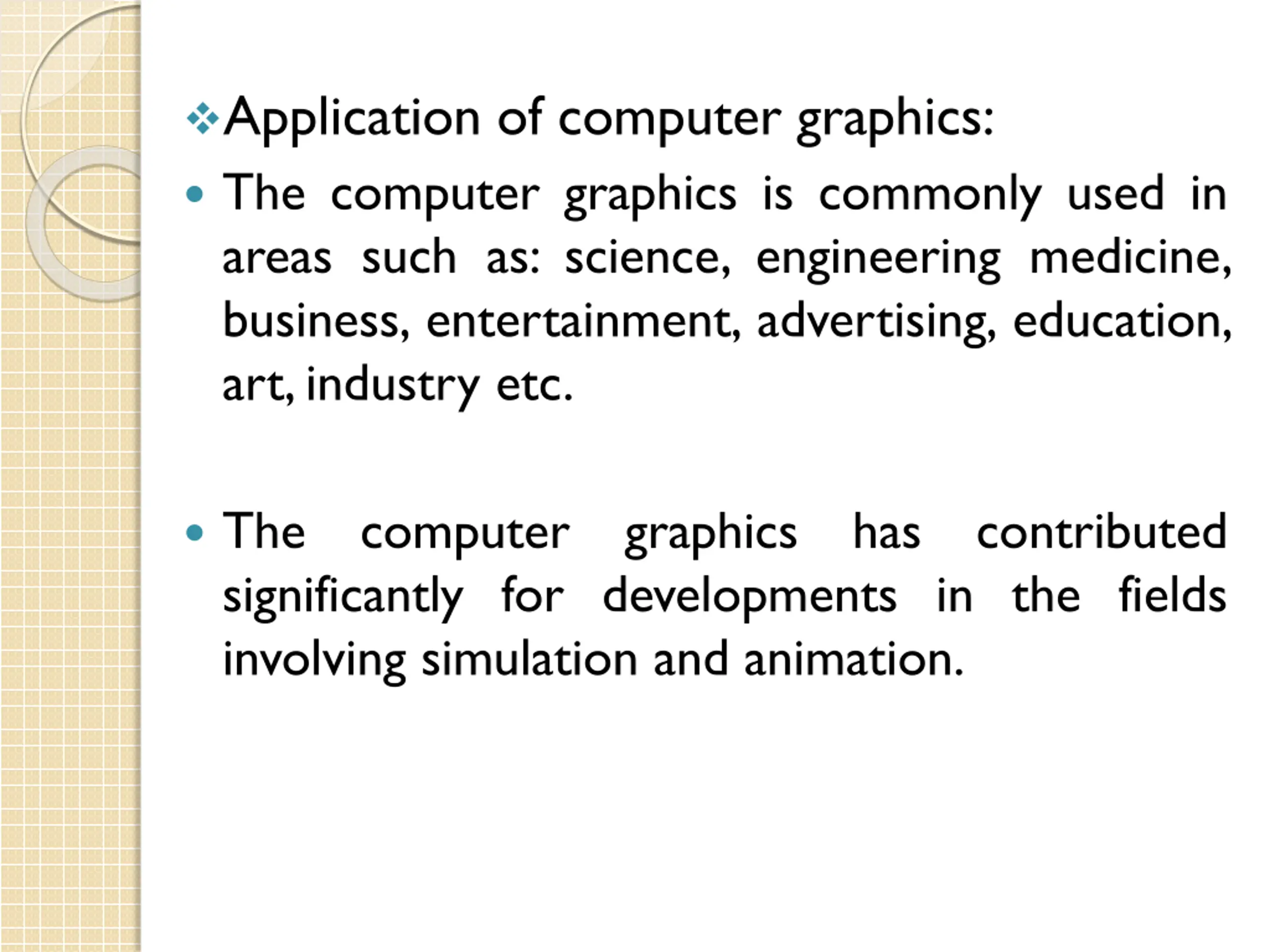 Application of computer graphics: The computer graphics is commonly used in areas such as: science, engineering medicine, business, entertainment, advertising, education, art,industry etc. The significantly for developments in the fields involving simulation and animation. computer graphics has contributed