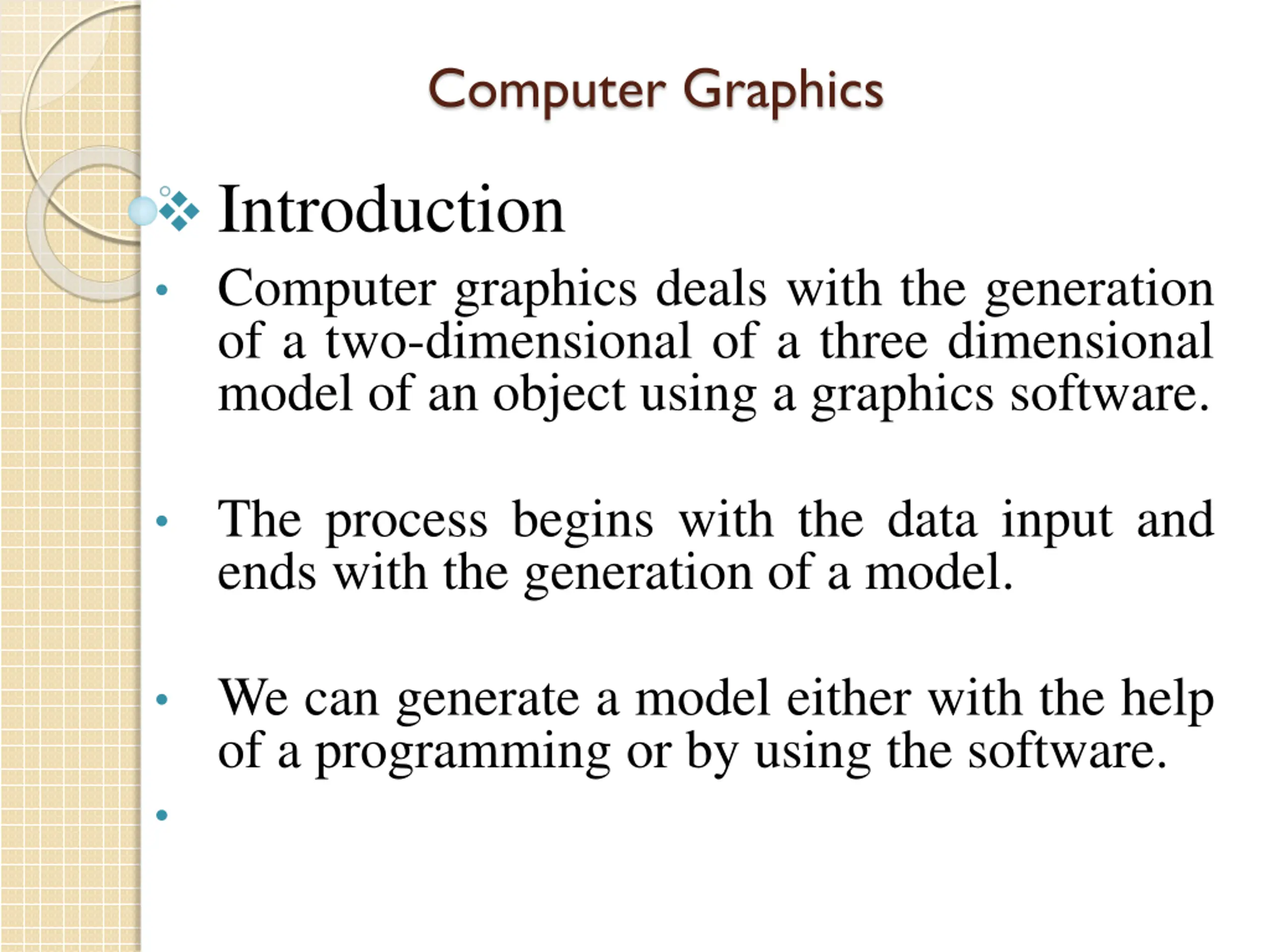 Computer Graphics Introduction Computer graphics deals with the generation of a two-dimensional of a three dimensional model of an object using a graphics software. The process begins with the data input and ends with the generation of a model. We can generate a model either with the help of a programming or by using the software.