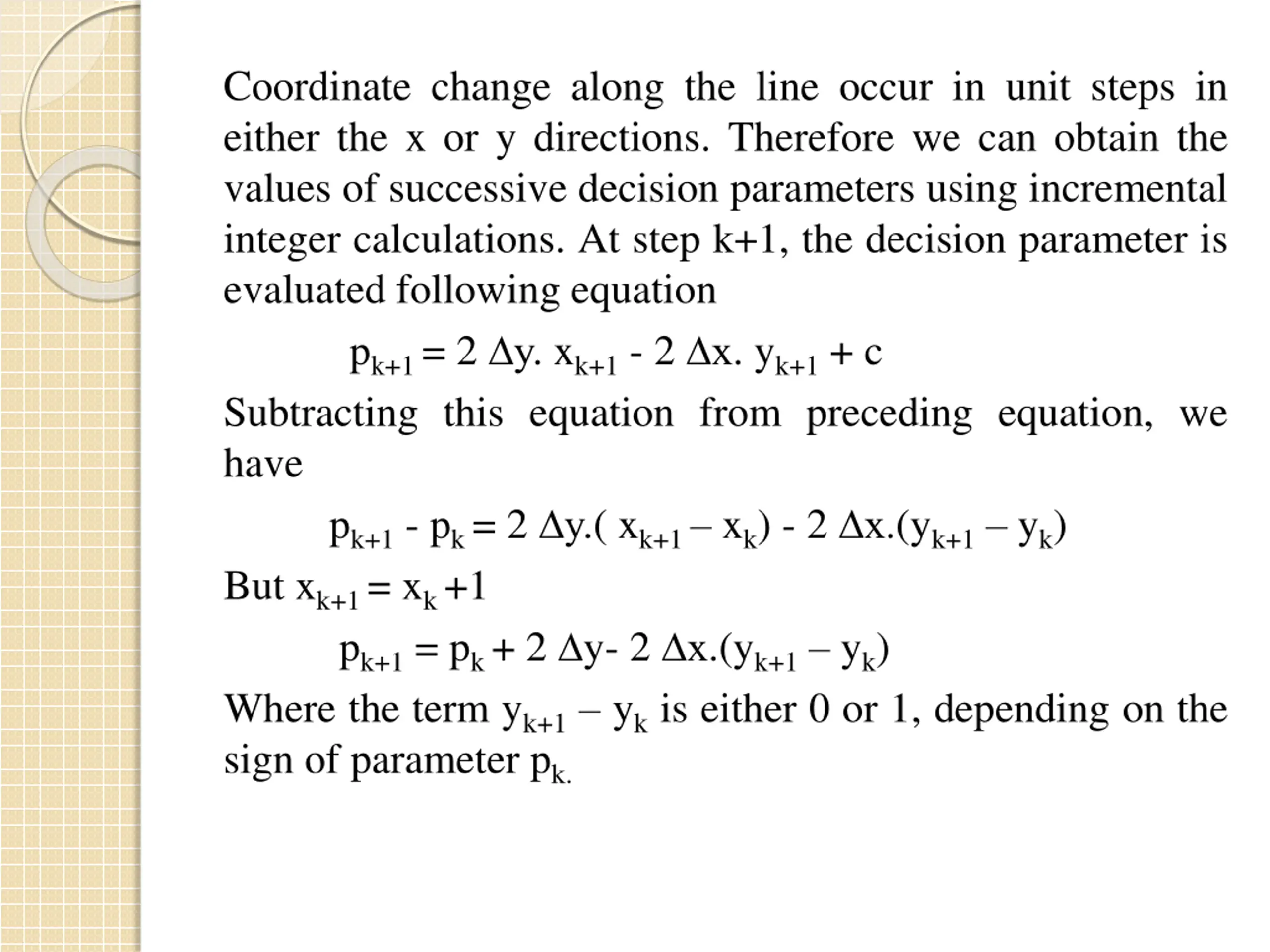 Coordinate change along the line occur in unit steps in either the x or y directions. Therefore we can obtain the values of successive decision parameters using incremental integer calculations. At step k+1, the decision parameter is evaluated following equation pk+1= 2 y. xk+1- 2 x. yk+1+ c Subtracting this equation from preceding equation, we have pk+1- pk= 2 y.( xk+1 xk) - 2 x.(yk+1 yk) But xk+1= xk+1 pk+1= pk+ 2 y- 2 x.(yk+1 yk) Where the term yk+1 ykis either 0 or 1, depending on the sign of parameter pk.