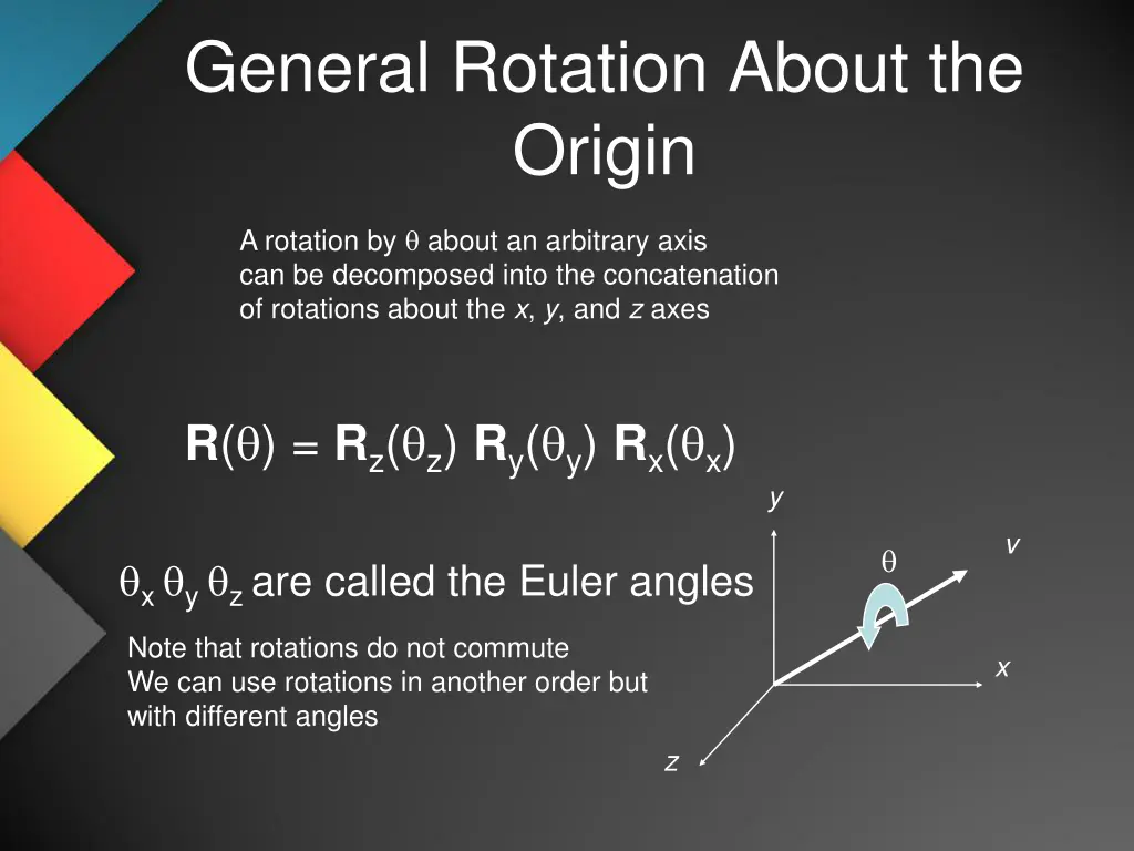 General Rotation About the Origin A rotation by about an arbitrary axis can be decomposed into the concatenation of rotations about the x, y, and z axes R( ) = Rz( z) Ry( y) Rx( x) y v x y z are called the Euler angles Note that rotations do not commute We can use rotations in another order but with different angles x z