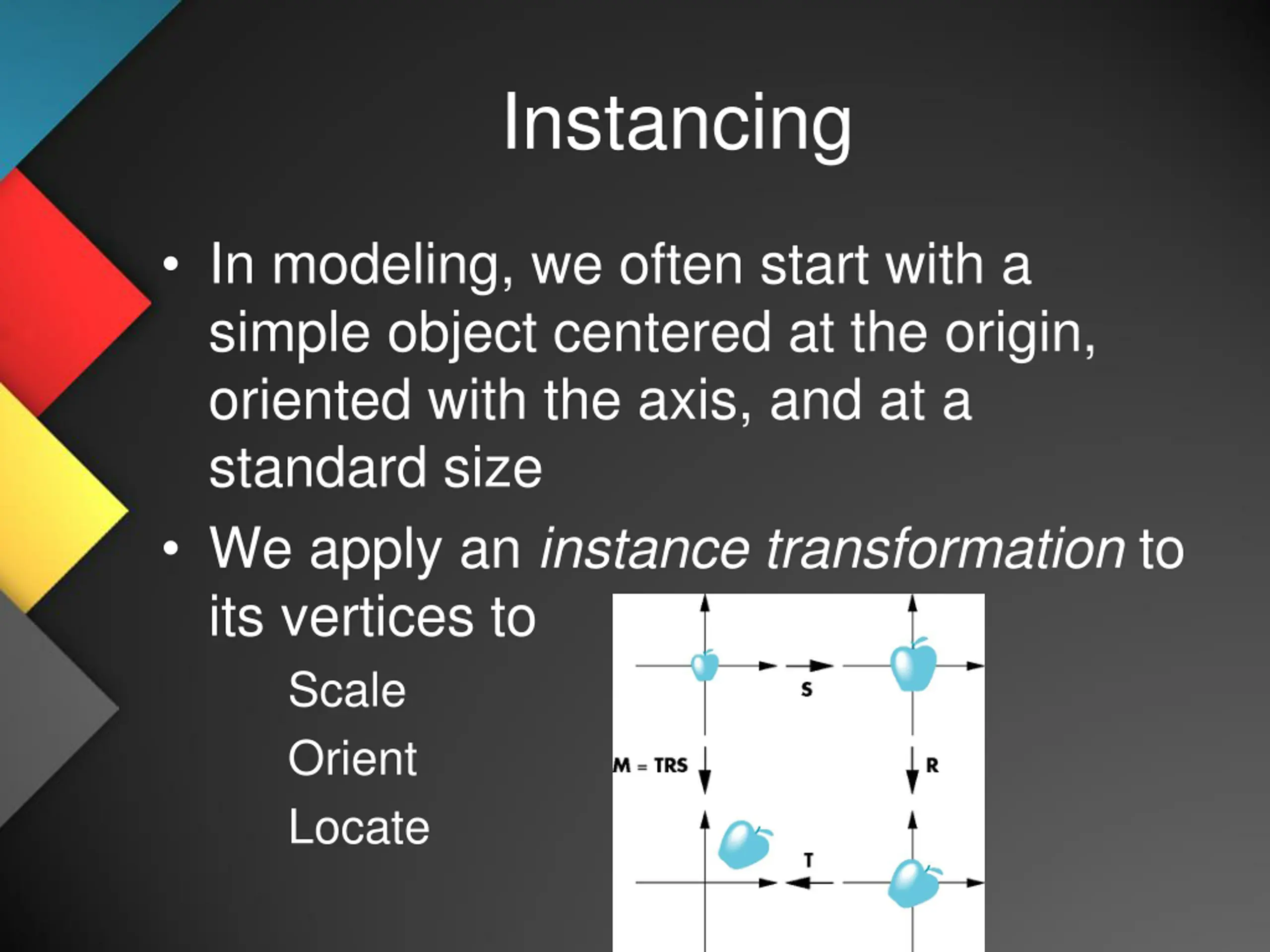 Instancing In modeling, we often start with a simple object centered at the origin, oriented with the axis, and at a standard size We apply an instance transformation to its vertices to Scale Orient Locate