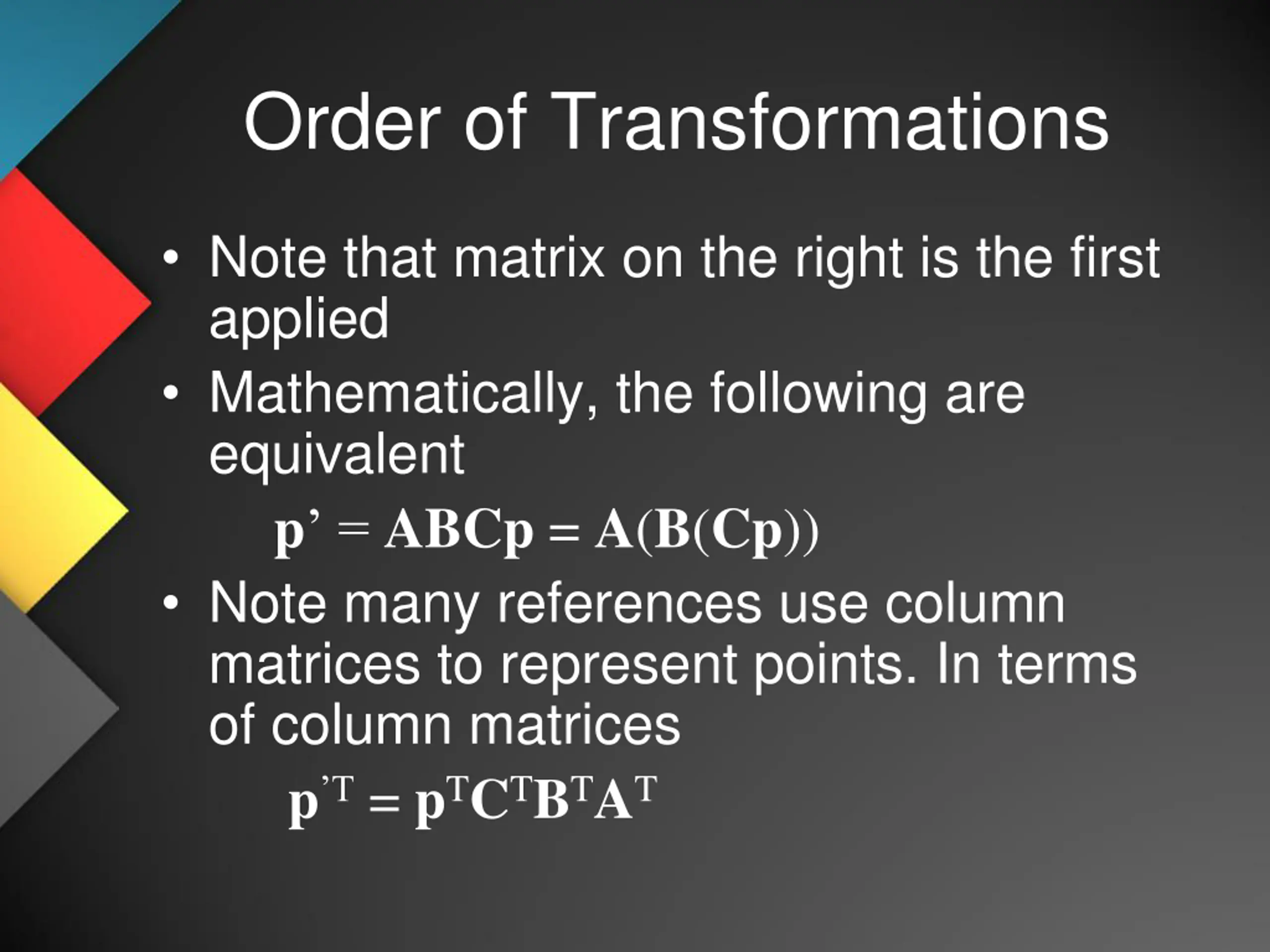 Order of Transformations Note that matrix on the right is the first applied Mathematically, the following are equivalent p = ABCp = A(B(Cp)) Note many references use column matrices to represent points. In terms of column matrices p T = pTCTBTAT