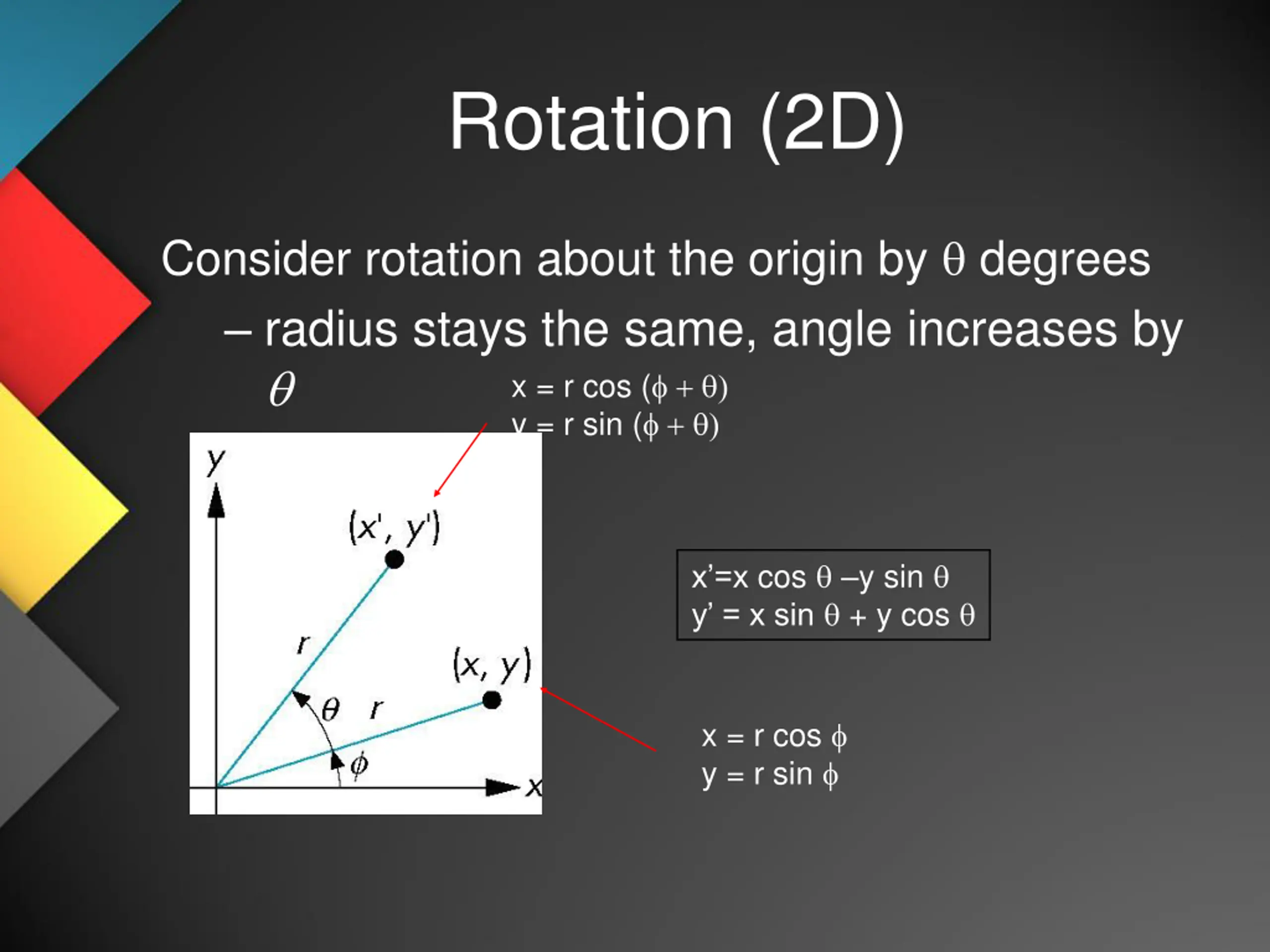 Rotation (2D) Consider rotation about the origin by degrees radius stays the same, angle increases by y = r sin ( + ) x = r cos ( + ) x =x cos y sin y = x sin + y cos x = r cos y = r sin