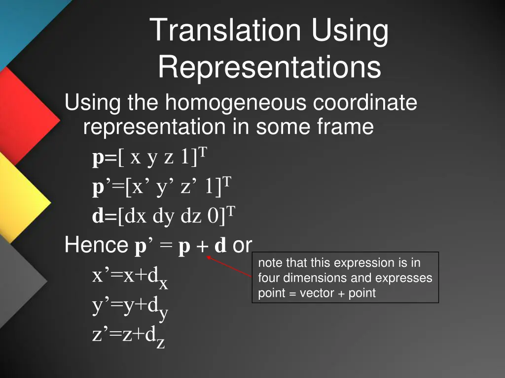 Translation Using Representations Using the homogeneous coordinate representation in some frame p=[ x y z 1]T p =[x y z 1]T d=[dx dy dz 0]T Hence p = p + d or x =x+dx y =y+dy z =z+dz note that this expression is in four dimensions and expresses point = vector + point