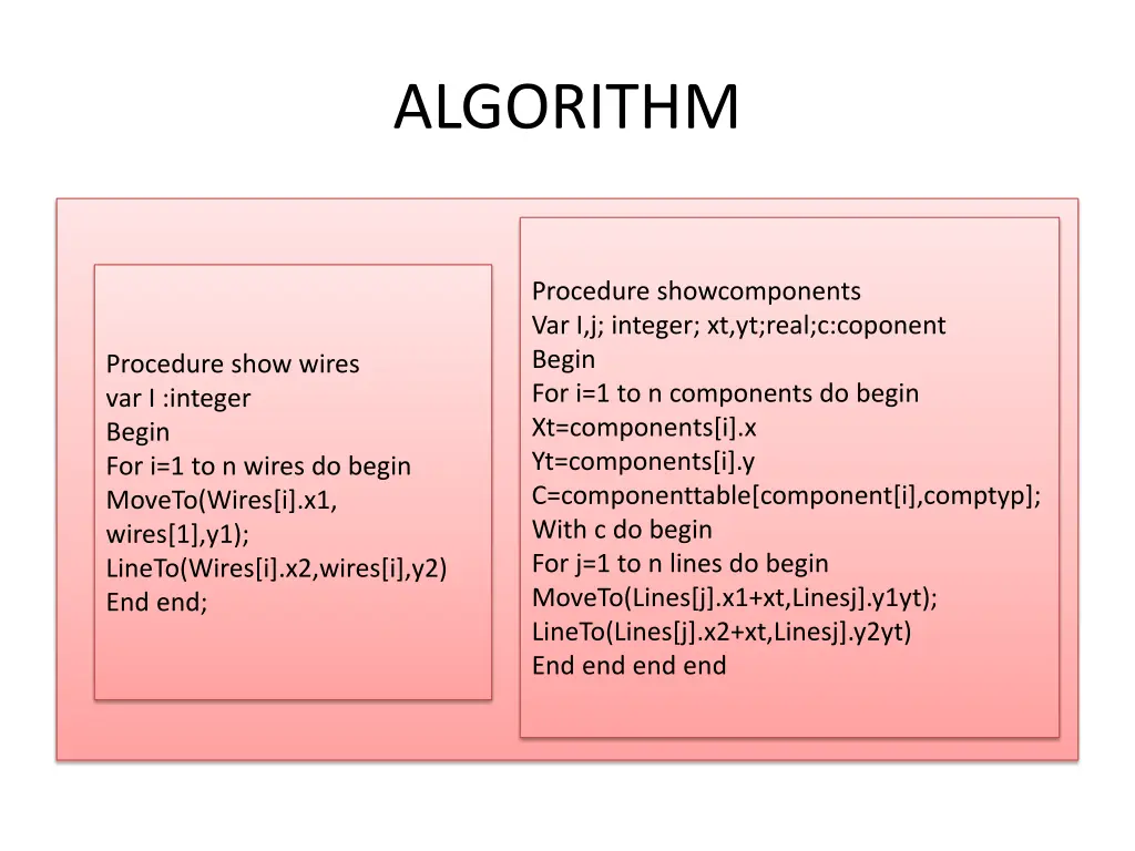 ALGORITHM Procedure showcomponents Var I,j; integer; xt,yt;real;c:coponent Begin For i=1 to n components do begin Xt=components[i].x Yt=components[i].y C=componenttable[component[i],comptyp]; With c do begin For j=1 to n lines do begin MoveTo(Lines[j].x1+xt,Linesj].y1yt); LineTo(Lines[j].x2+xt,Linesj].y2yt) End end end end Procedure show wires var I :integer Begin For i=1 to n wires do begin MoveTo(Wires[i].x1, wires[1],y1); LineTo(Wires[i].x2,wires[i],y2) End end;