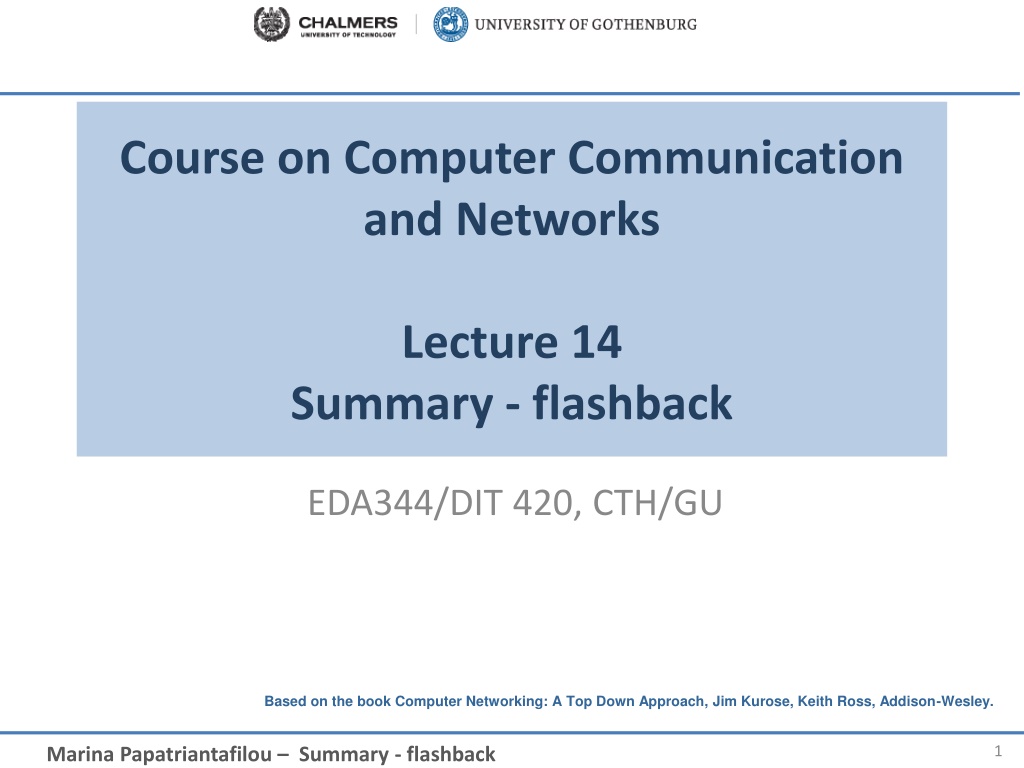 Course on Computer Communication and Networks Lecture 14 Summary - flashback EDA344/DIT 420, CTH/GU Based on the book Computer Networking: A Top Down Approach, Jim Kurose, Keith Ross, Addison-Wesley. 1 Marina Papatriantafilou Summary - flashback