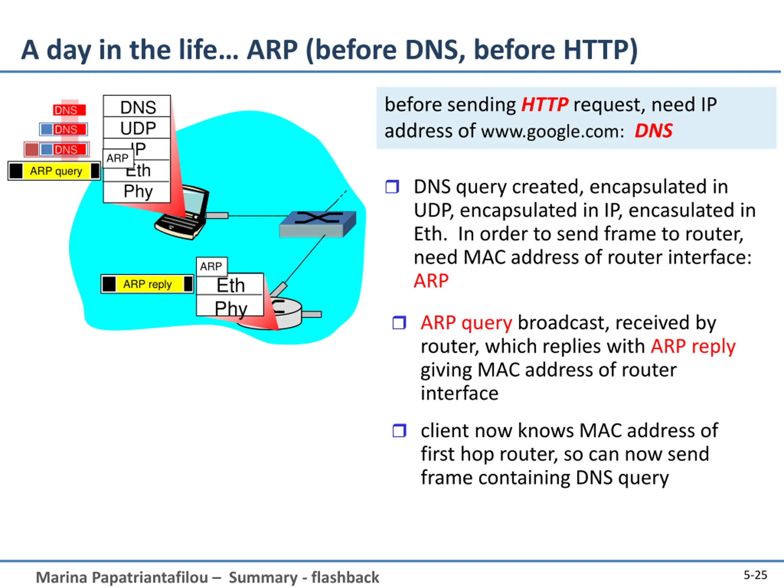 A day in the life ARP (before DNS, before HTTP) before sending HTTP request, need IP address of www.google.com: DNS DNS UDP IP Eth Phy DNS DNS DNS ARP ARP query DNS query created, encapsulated in UDP, encapsulated in IP, encasulated in Eth. In order to send frame to router, need MAC address of router interface: ARP ARP Eth Phy ARP reply ARP query broadcast, received by router, which replies with ARP reply giving MAC address of router interface client now knows MAC address of first hop router, so can now send frame containing DNS query 5-25 Marina Papatriantafilou Summary - flashback