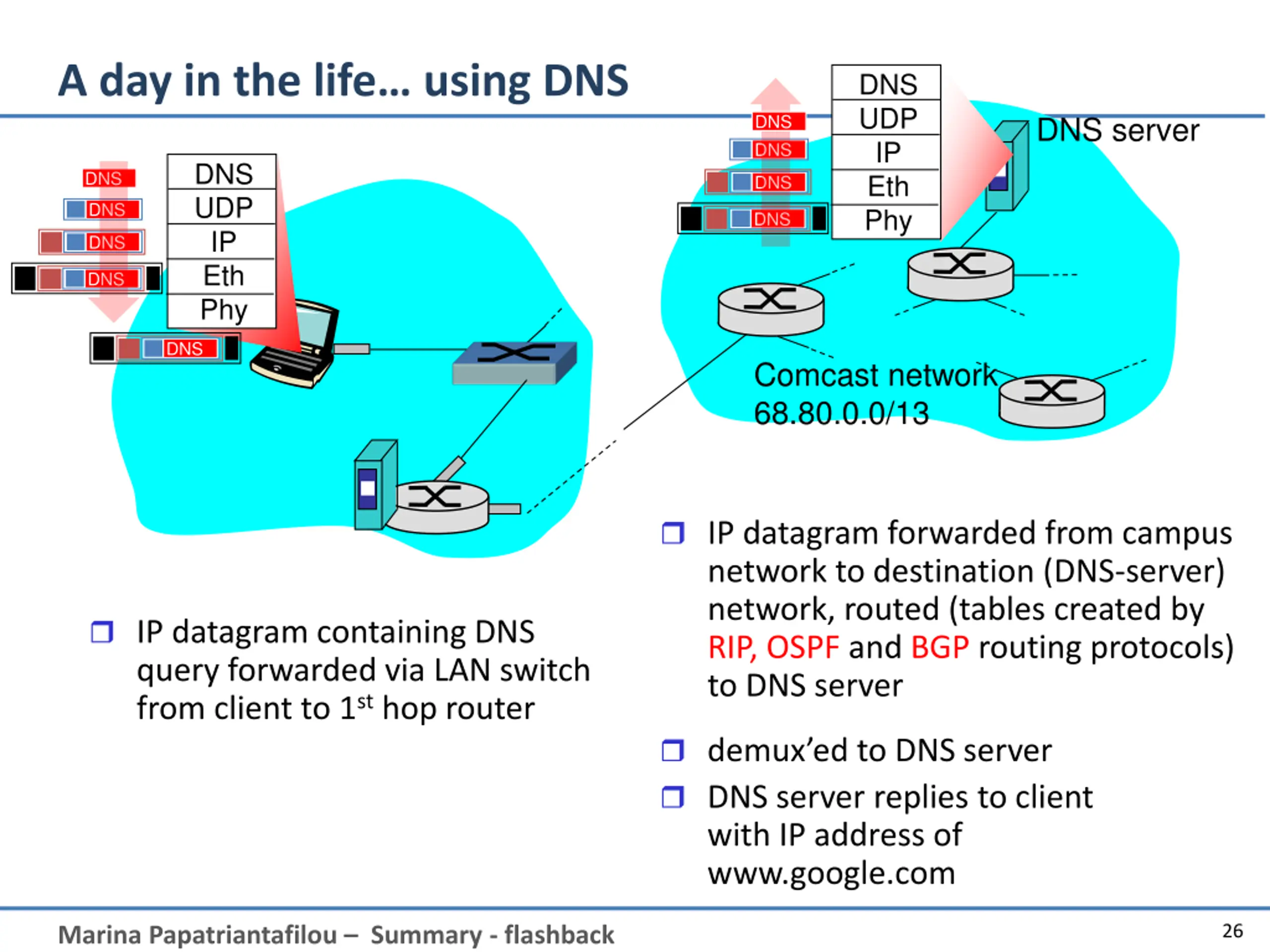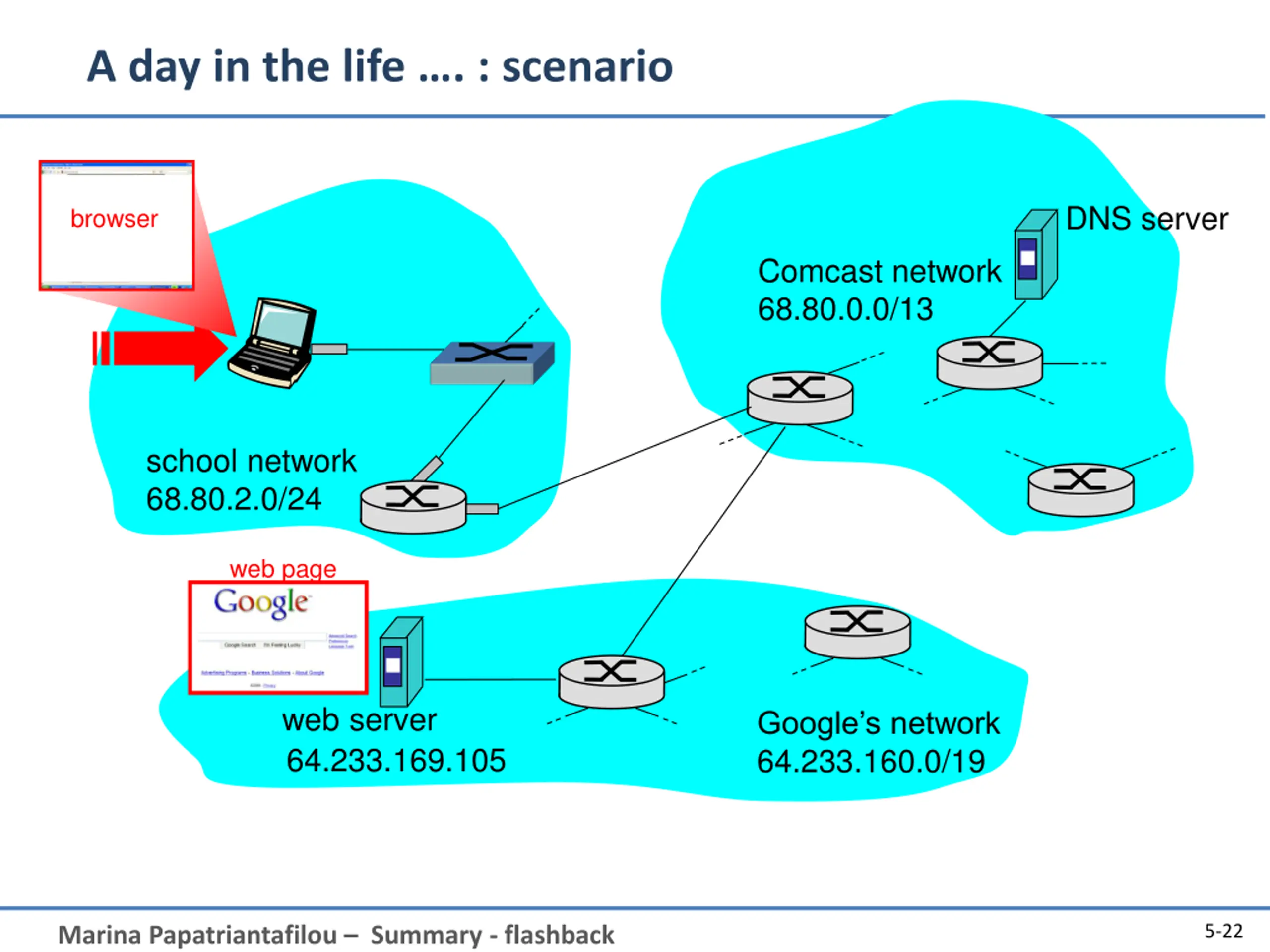 A day in the life . : scenario DNS server browser Comcast network 68.80.0.0/13 school network 68.80.2.0/24 web page web server Google s network 64.233.160.0/19 64.233.169.105 5-22 Marina Papatriantafilou Summary - flashback