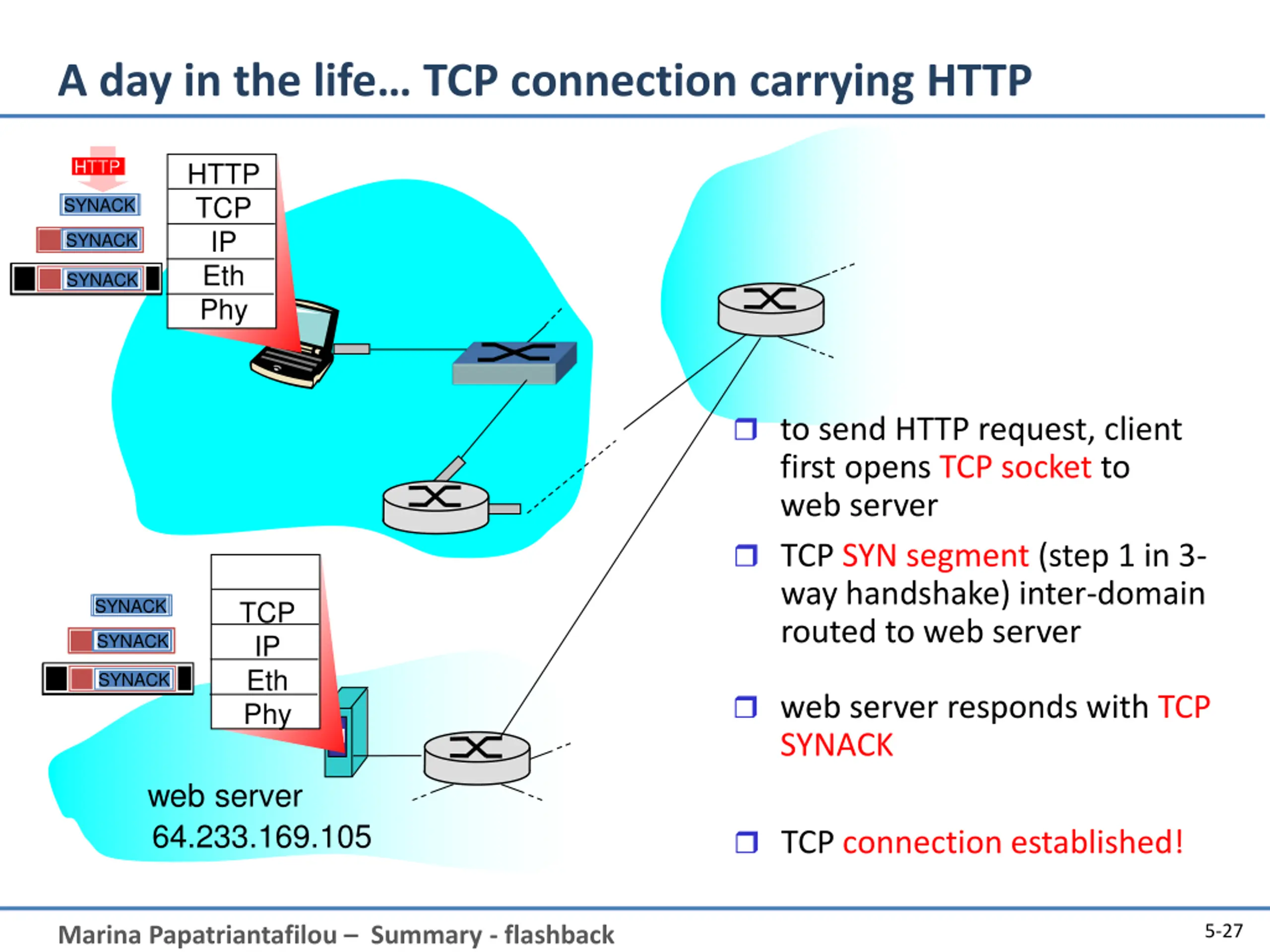 A day in the life TCP connection carrying HTTP HTTP HTTP TCP IP Eth Phy SYNACK SYN SYN SYNACK SYNACK SYN SYN to send HTTP request, client first opens TCP socket to web server TCP SYN segment (step 1 in 3- way handshake) inter-domain routed to web server TCP IP Eth Phy SYNACK SYN SYN SYNACK SYNACK SYNACK SYN web server responds with TCP SYNACK web server 64.233.169.105 TCP connection established! 5-27 Marina Papatriantafilou Summary - flashback