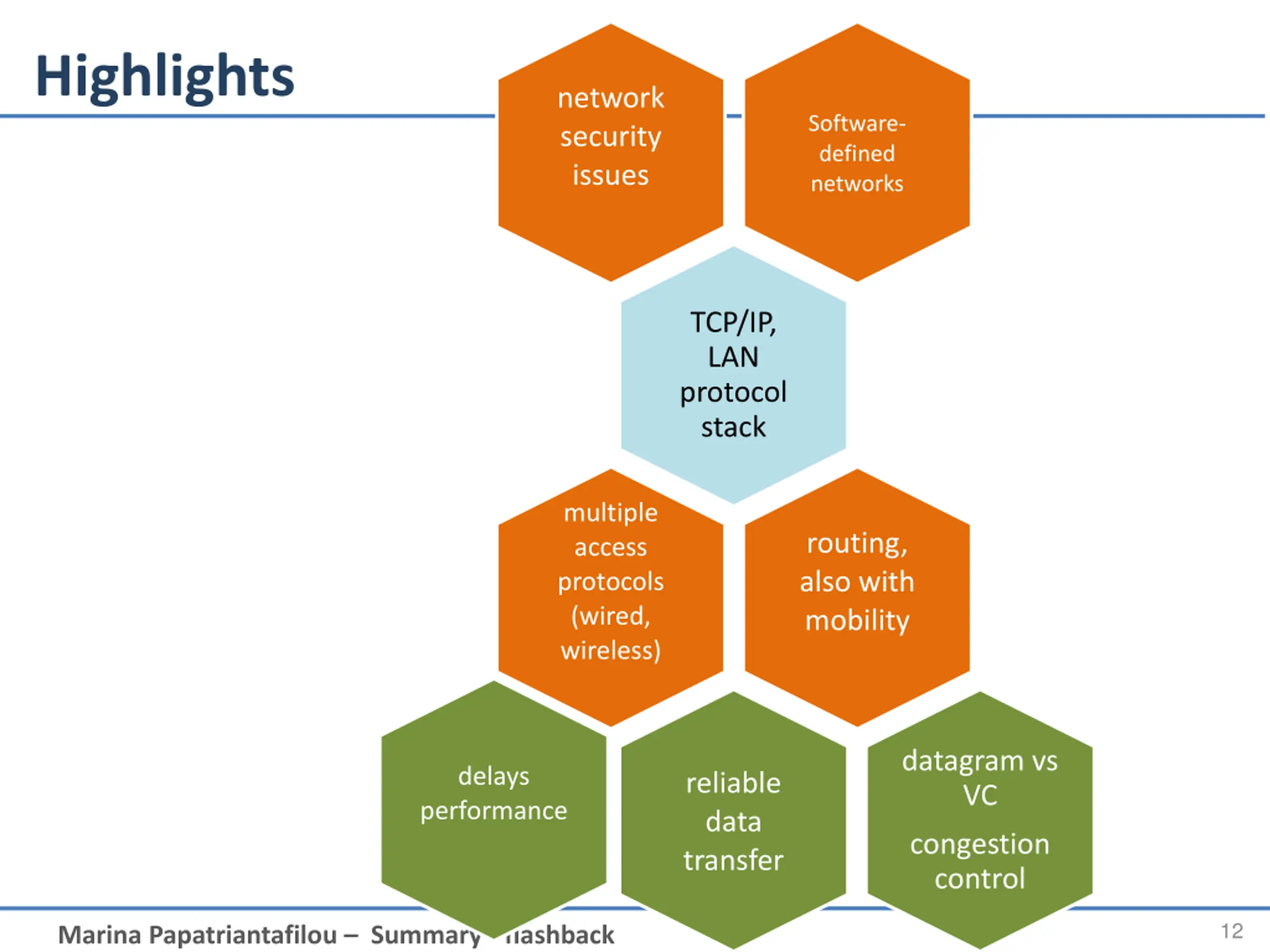 Highlights network security issues Software- defined networks TCP/IP, LAN protocol stack multiple access protocols (wired, wireless) routing, also with mobility datagram vs VC delays performance reliable data transfer congestion control 5 Marina Papatriantafilou Summary - flashback