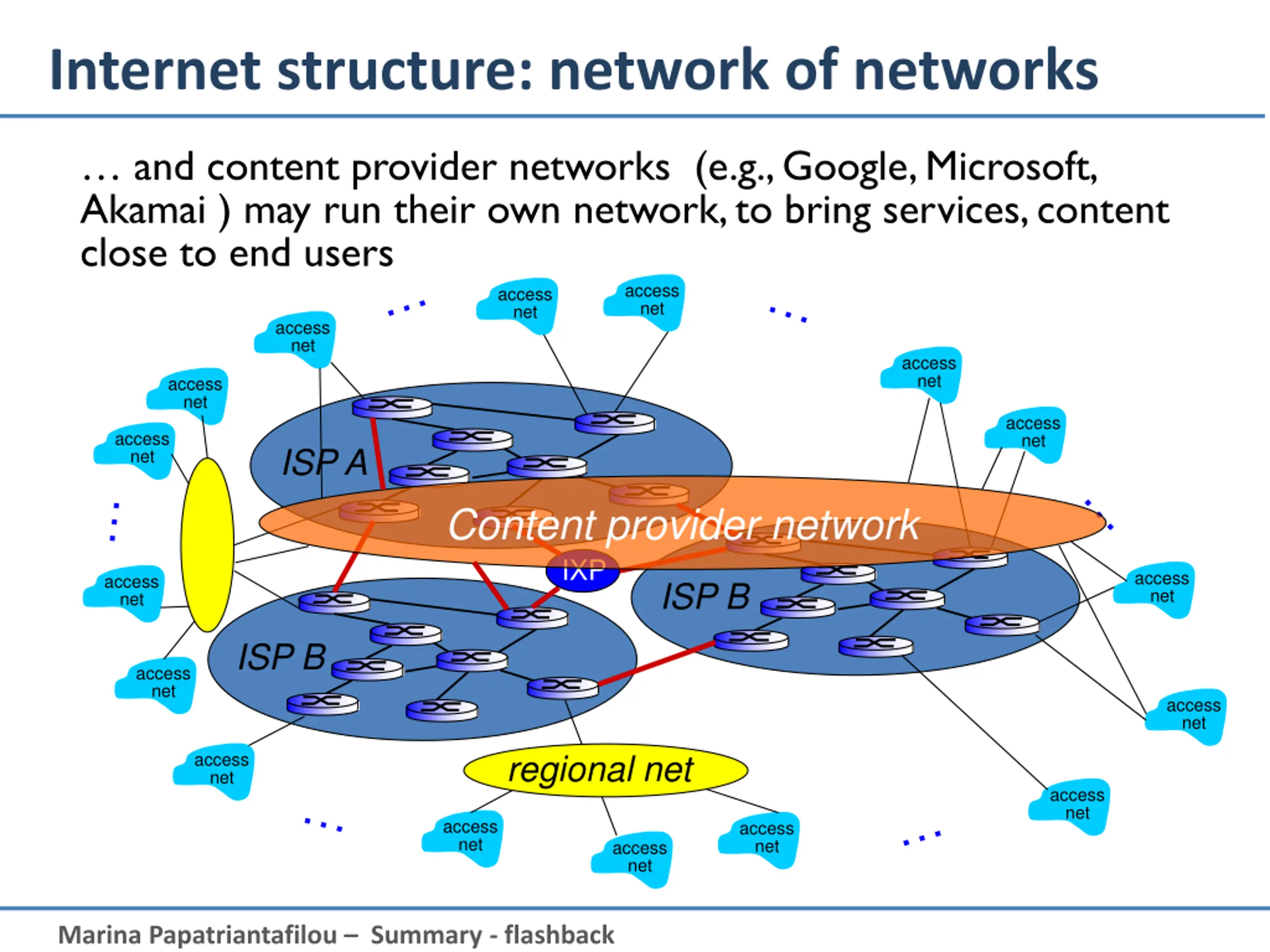 Internet structure: network of networks and content provider networks (e.g., Google, Microsoft, Akamai ) may run their own network, to bring services, content close to end users access net access net access net access net access net access net access net ISP A Content provider network IXP access net access net ISP B ISP B access net access net regional net access net access net access net access net access net Marina Papatriantafilou Summary - flashback